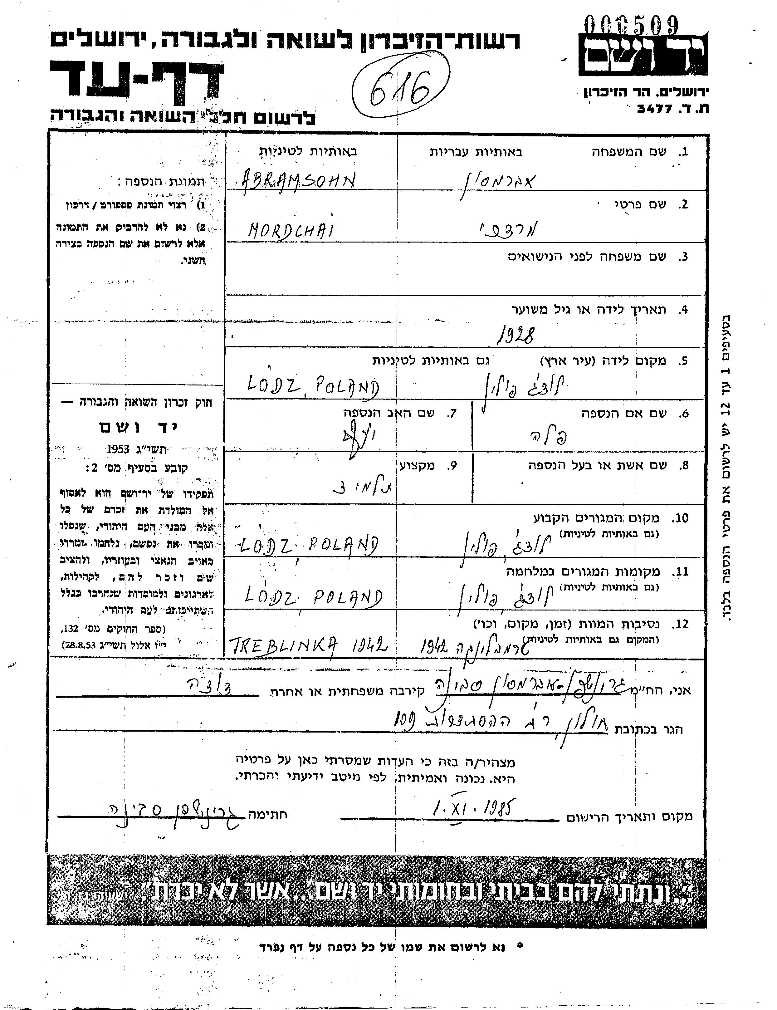 Mordchai Abramsohn wurde im Jahr 1928 in Lodz, Polen geboren. Er war der Sohn von Yaakov und Fela. Er war Schüler/-in. Vor dem Zweiten Weltkrieg lebte er in Lodz, Polen. Während des Krieges war er in Lodz, Polen.