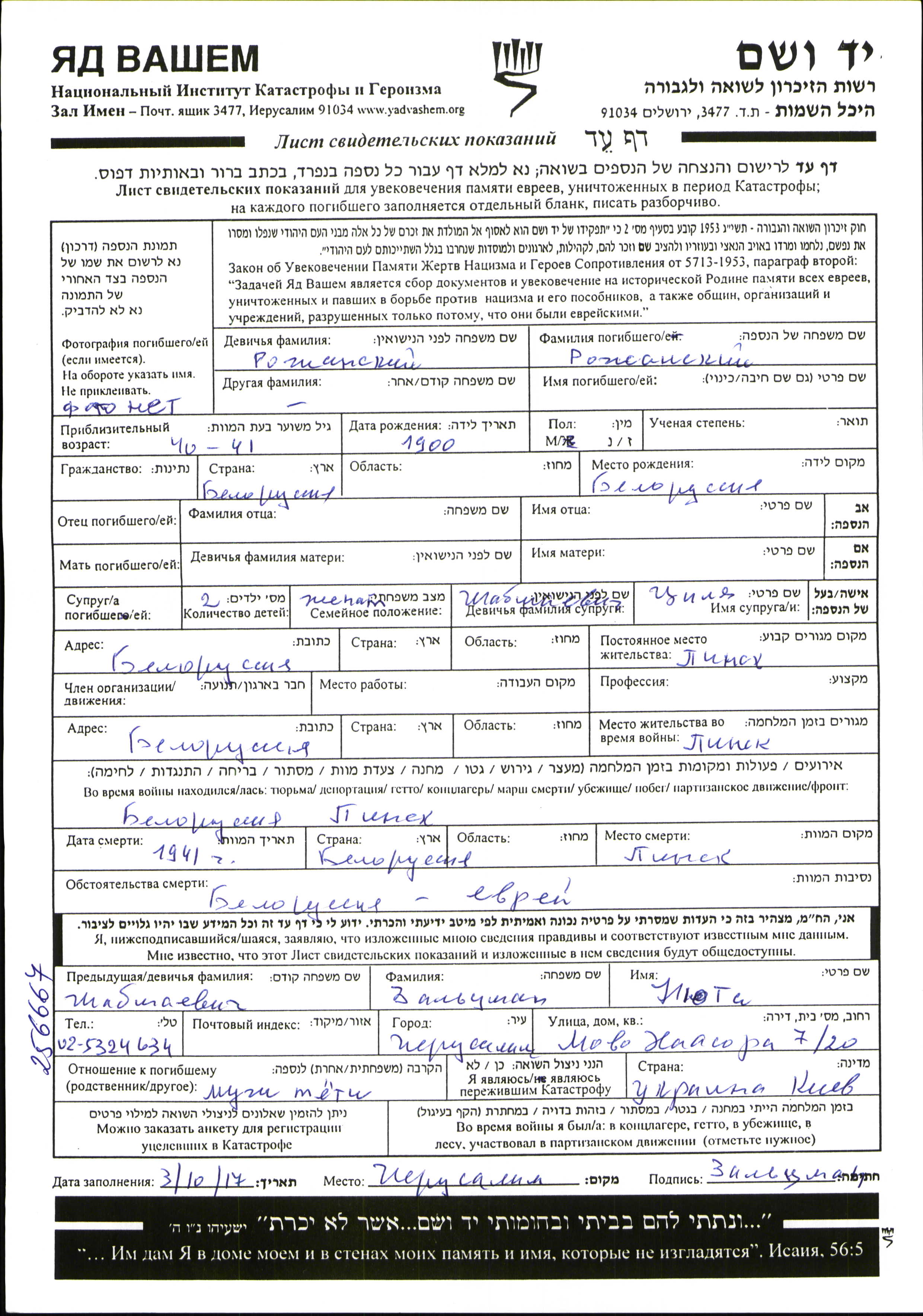 Vorname unbekannt Rozhanski wurde im Jahr 1900 in Weißrussland (UdSSR) geboren. Er war mit Tzilya, geb. Shabshayevich Verheiratet. Vor dem Zweiten Weltkrieg lebte er in Pinsk, Polen. Während des Krieges war er in Pinsk, Polen.
