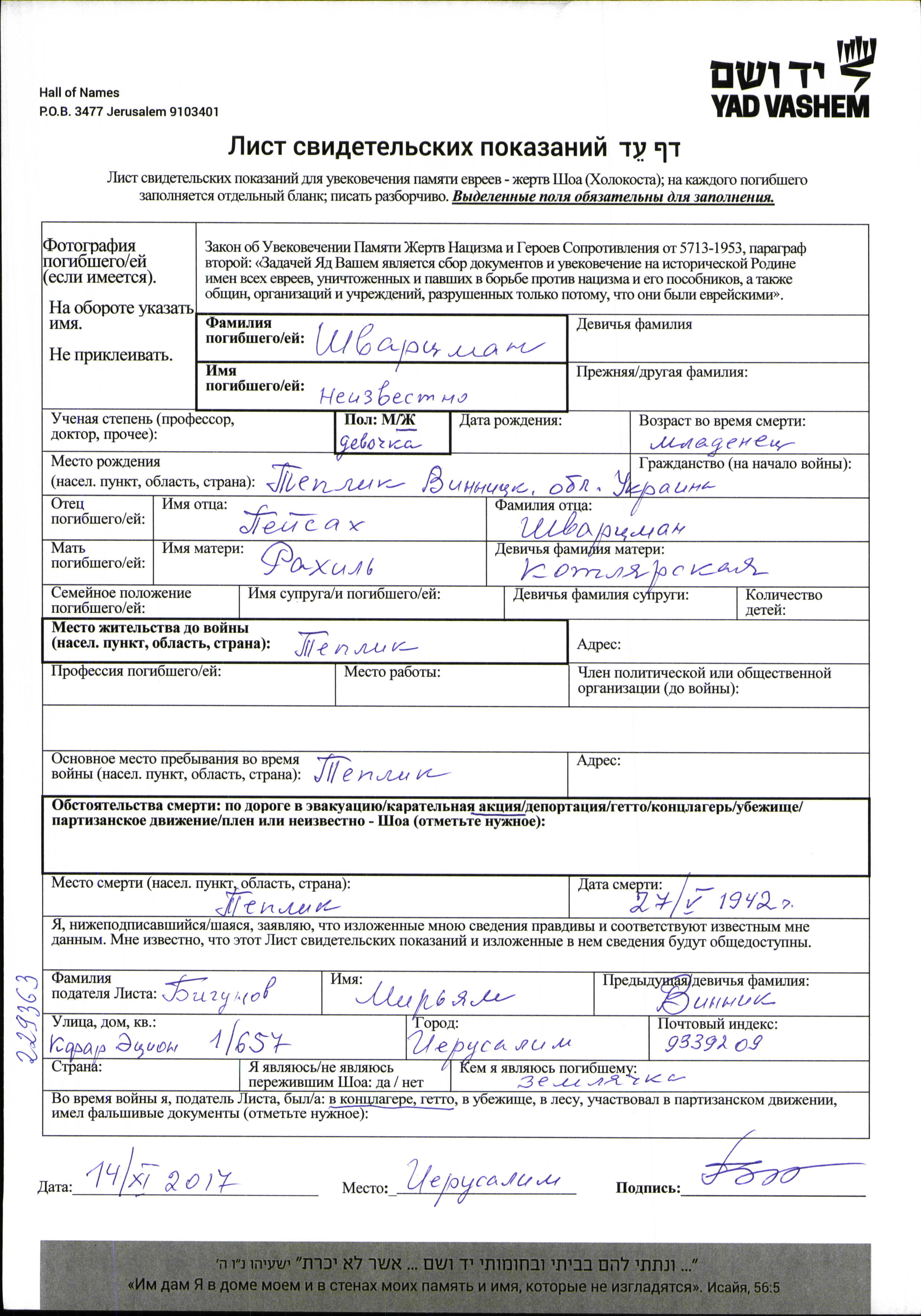 Vorname unbekannt Shvartzman wurde in Teplik, Ukraine (UdSSR) geboren. Sie war die Tochter von Peysakh und Rakhil, geb. Kotlyarskaya. Vor dem Zweiten Weltkrieg lebte sie in Teplik, Ukraine (UdSSR). Während des Krieges war sie in Teplik, Ukraine (UdSSR).