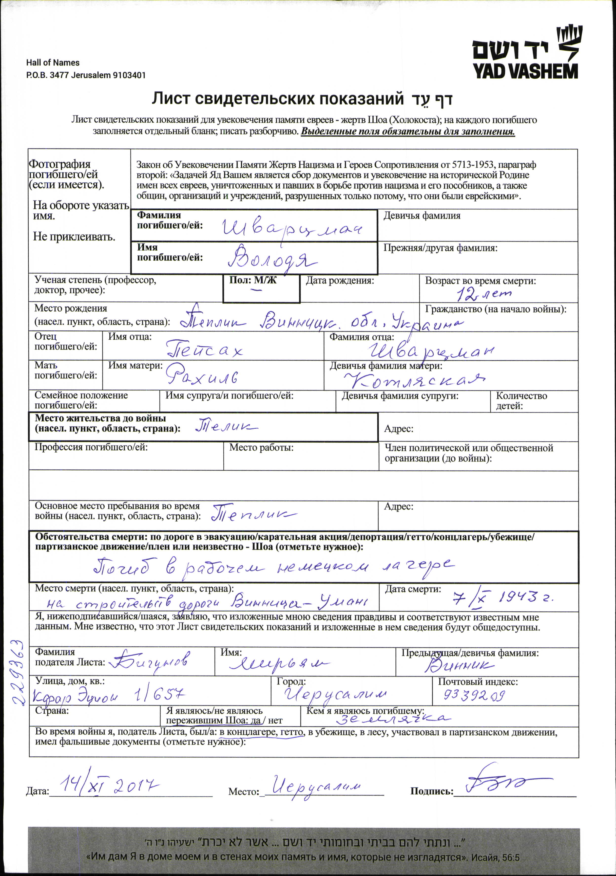 Volodya wurde in der Schoah ermordet. Todesort: unbekannt im Jahr 07/10/1943.