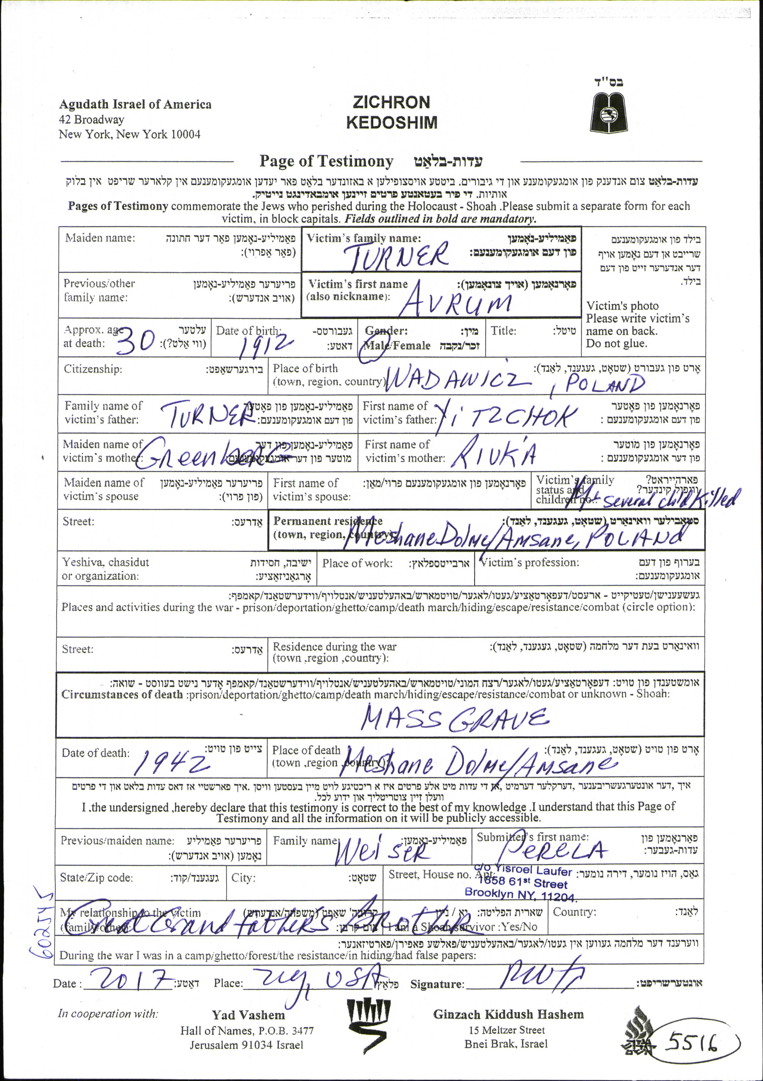 Avrum wurde in der Schoah ermordet. Todesort: Mszana Dolna, Massaker Ort im Jahr 1942.