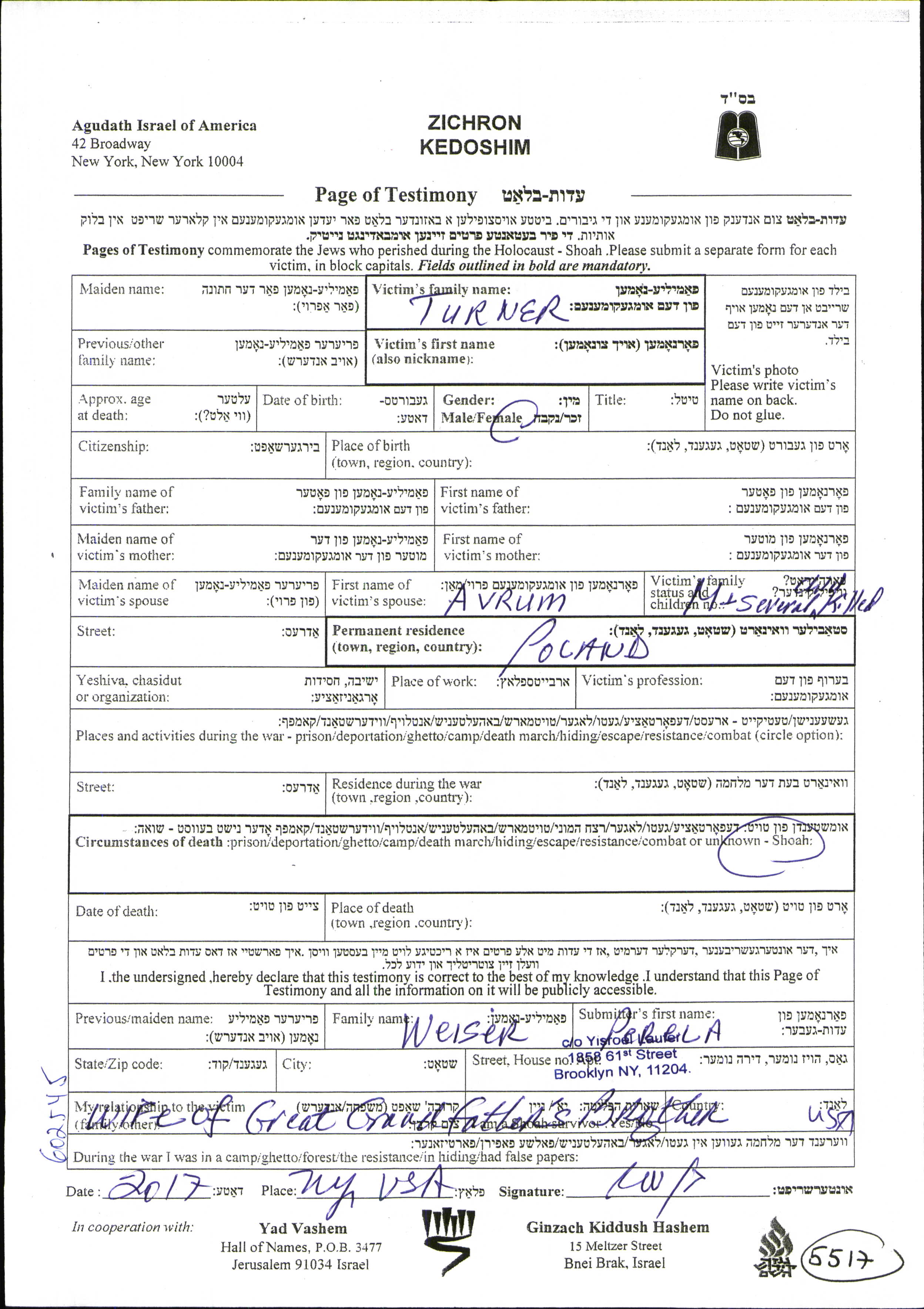 Vorname unbekannt Turner. Sie war mit Avrum Verheiratet. Vor dem Zweiten Weltkrieg lebte sie in Polen.
