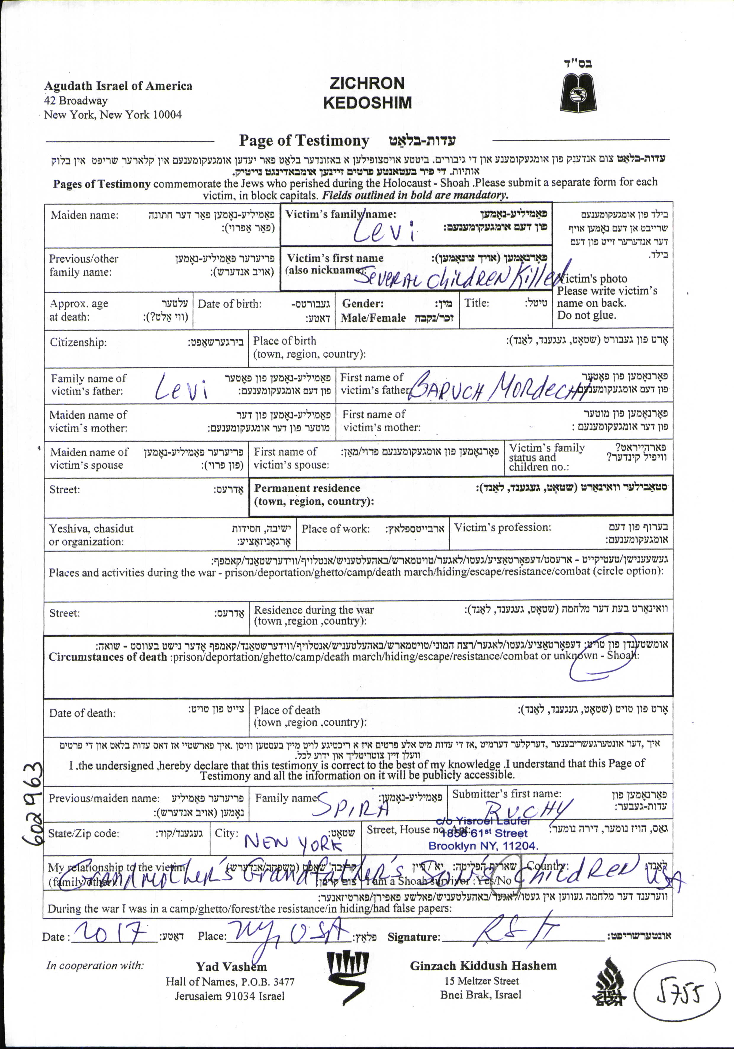 Vorname unbekannt Levi wurde Er/sie war der/ die Sohn/Tochter von Baruch Mordechi. Er/Sie war Kind.