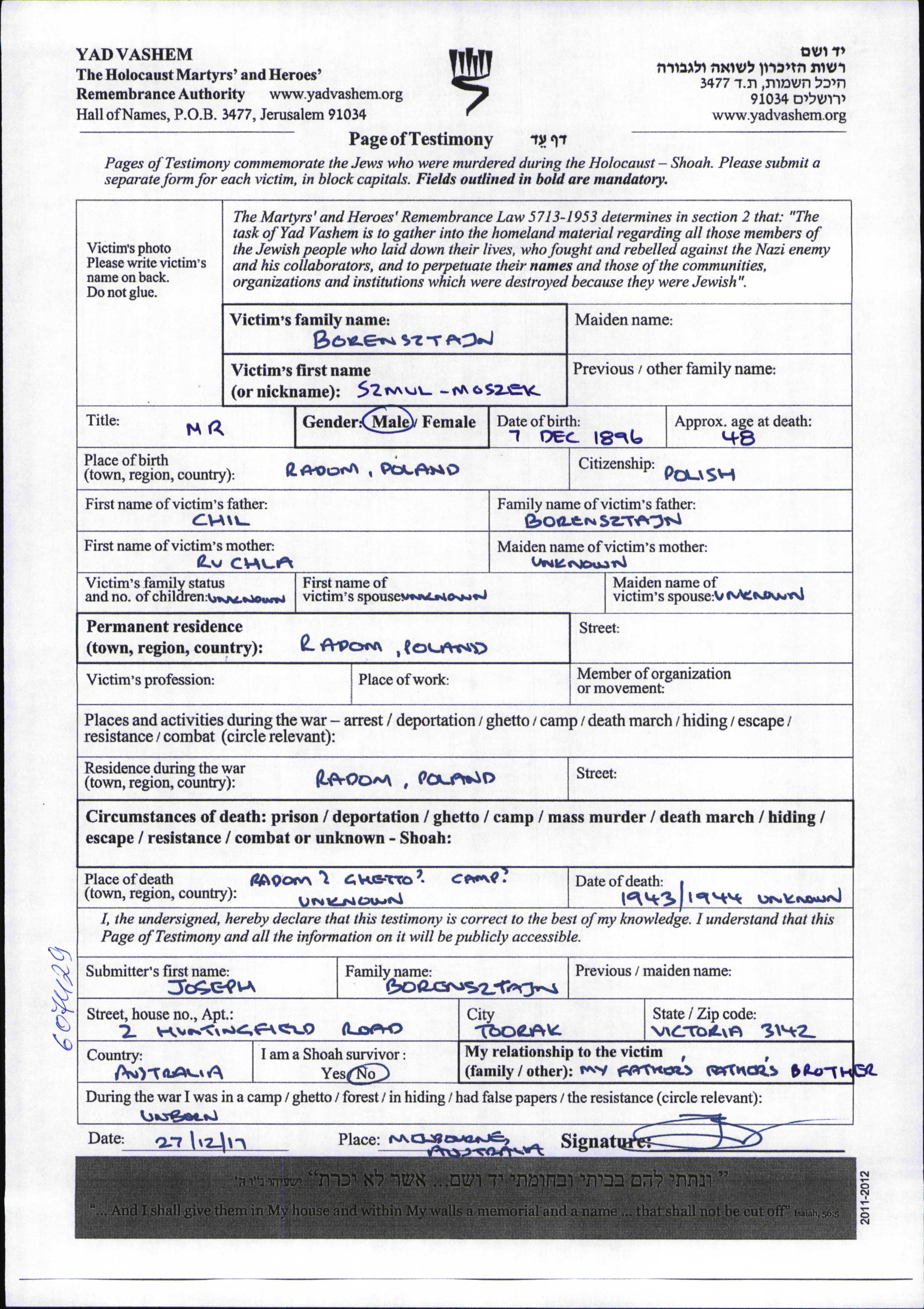 Szmul Moszek Borensztajn wurde im Jahr 1896 in Radom, Polen geboren. Er war der Sohn von Chil und Ruchla. Vor dem Zweiten Weltkrieg lebte er in Radom, Polen. Während des Krieges war er in Radom, Polen.