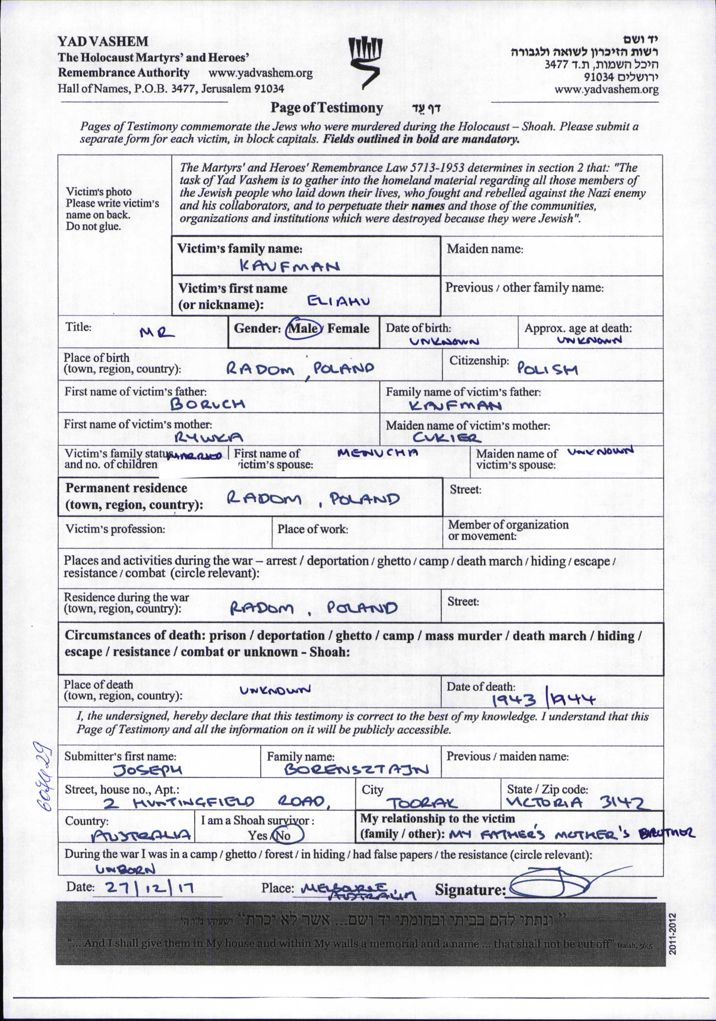 Elihau Kaufman wurde in Radom, Polen geboren. Er war der Sohn von Boruch und Rywka, geb. Cukier. Er war mit Menucha Verheiratet. Vor dem Zweiten Weltkrieg lebte er in Radom, Polen. Während des Krieges war er in Radom, Polen.