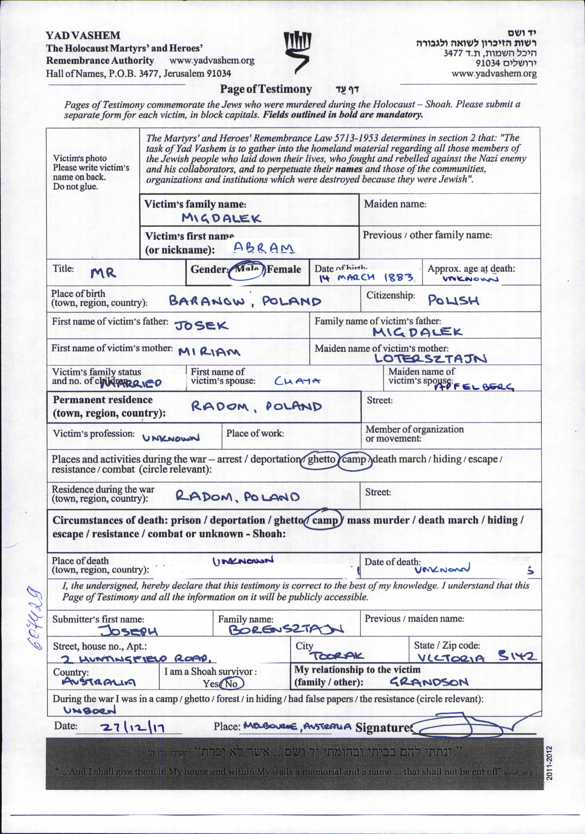 Abram Migdalek wurde im Jahr 1883 in Baranów, Polen geboren. Er war der Sohn von Josek und Miriam, geb. Lotersztajn. Er war mit Chaya, geb. Apfelberg Verheiratet. Vor dem Zweiten Weltkrieg lebte er in Radom, Polen. Während des Krieges war er in Radom, Polen.