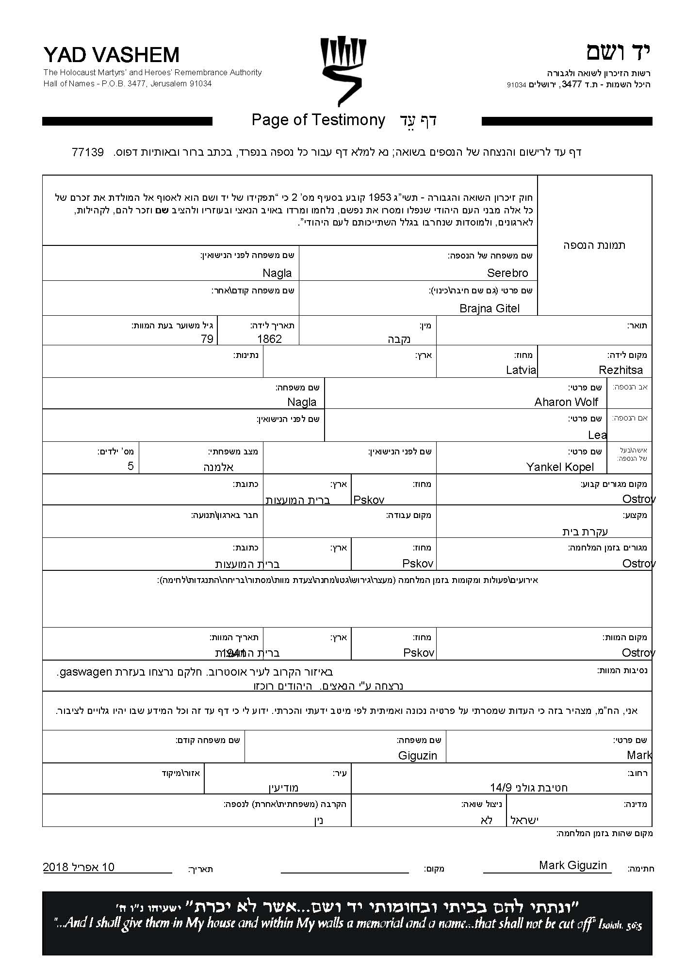 Brajna Gitel Serebro, geb. Nagla wurde im Jahr 1862 in Rezitza, Lettland geboren. Sie war die Tochter von Aharon Wolf und Lea. Sie war Hausfrau und mit Yankel Witwe. Vor dem Zweiten Weltkrieg lebte sie in Ostrov, Russland (UdSSR). Während des Krieges war sie in Ostrov, Russland (UdSSR).