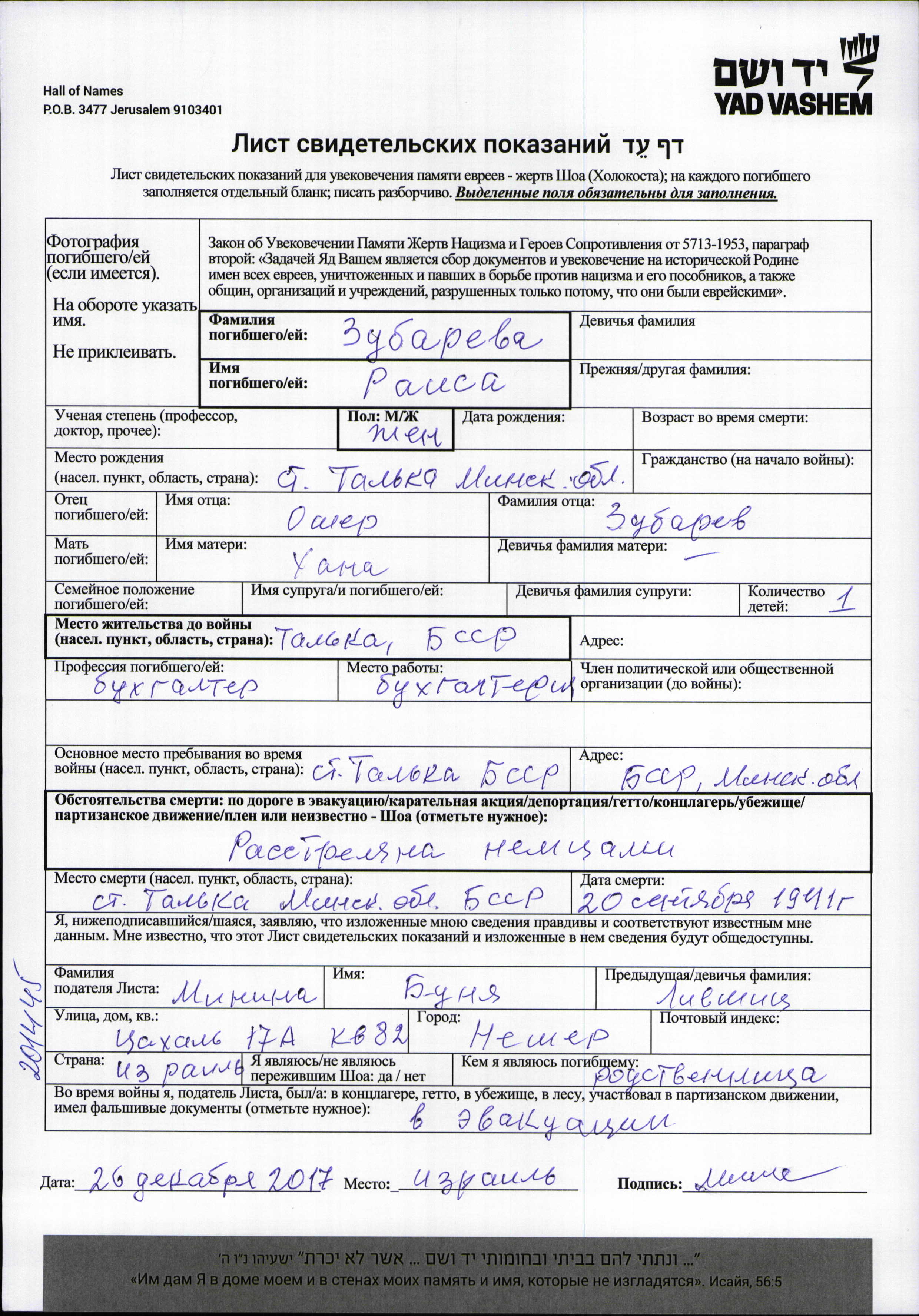 Raisa Zubareva wurde in Talka, Weißrussland (UdSSR) geboren. Sie war die Tochter von Osher und Khana. Sie war Wirtschaftsprüfer/-in. Vor dem Zweiten Weltkrieg lebte sie in Talka, Weißrussland (UdSSR). Während des Krieges war sie in Talka, Weißrussland (UdSSR).