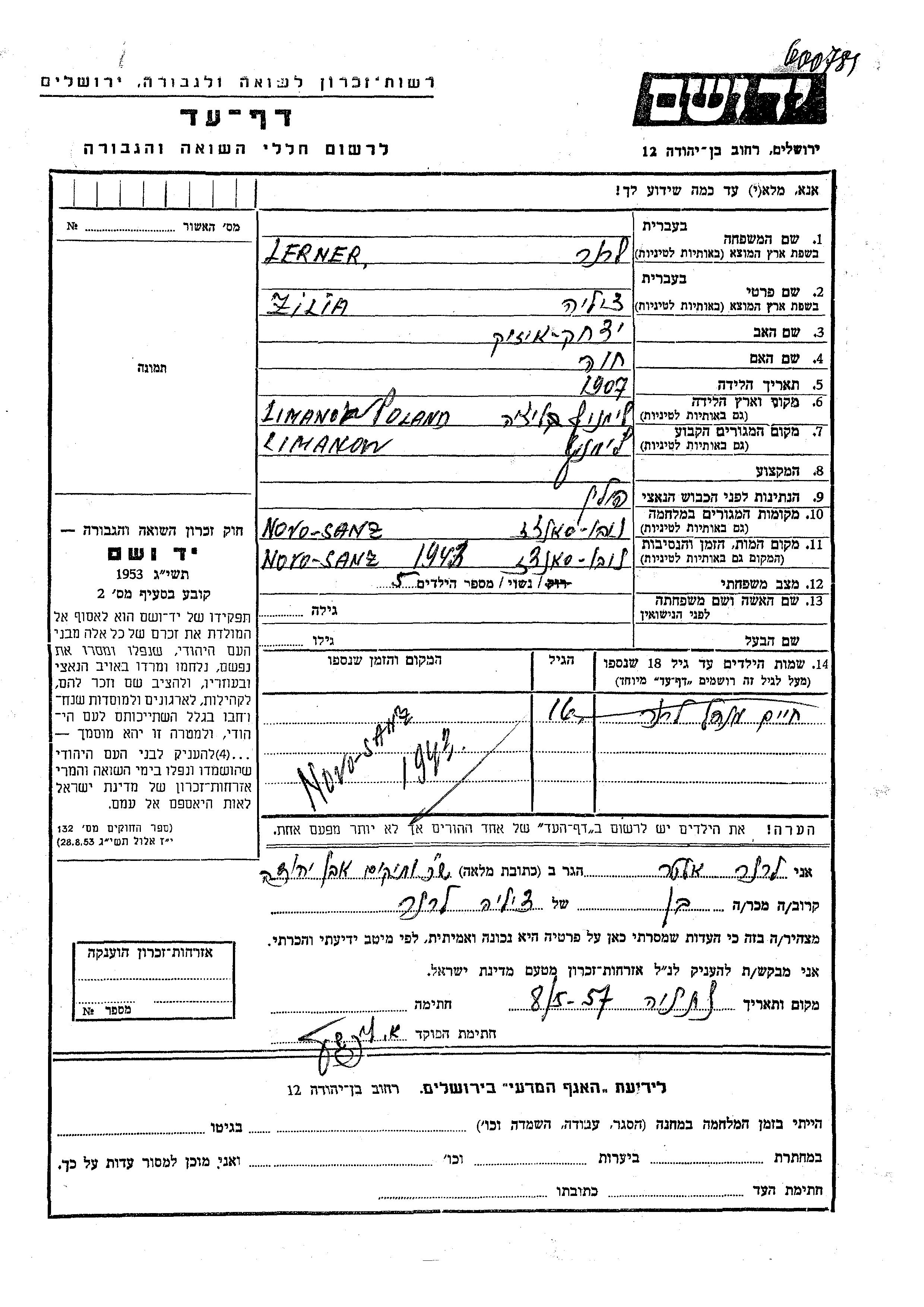 Zilia Lerner wurde im Jahr 1907 in Limanow, Polen geboren. Sie war die Tochter von Yitzkhak und Khava. Sie war Verheiratet. Vor dem Zweiten Weltkrieg lebte sie in Limanow, Polen. Während des Krieges war sie in Novisandz, Polen.