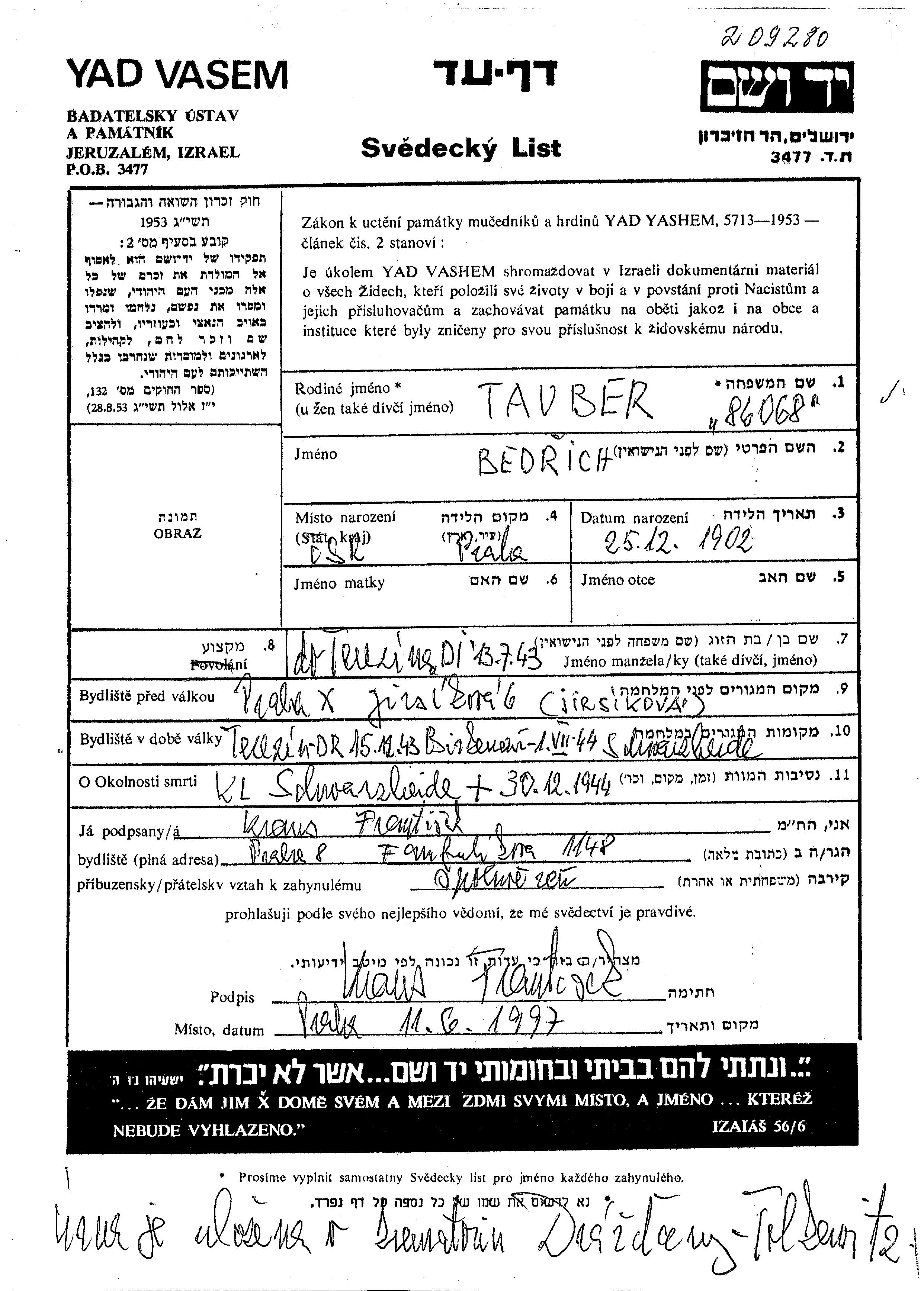 Tauber | Bedrich | 1902 | Prague, Tschechoslowakei | Verfolgtenliste |