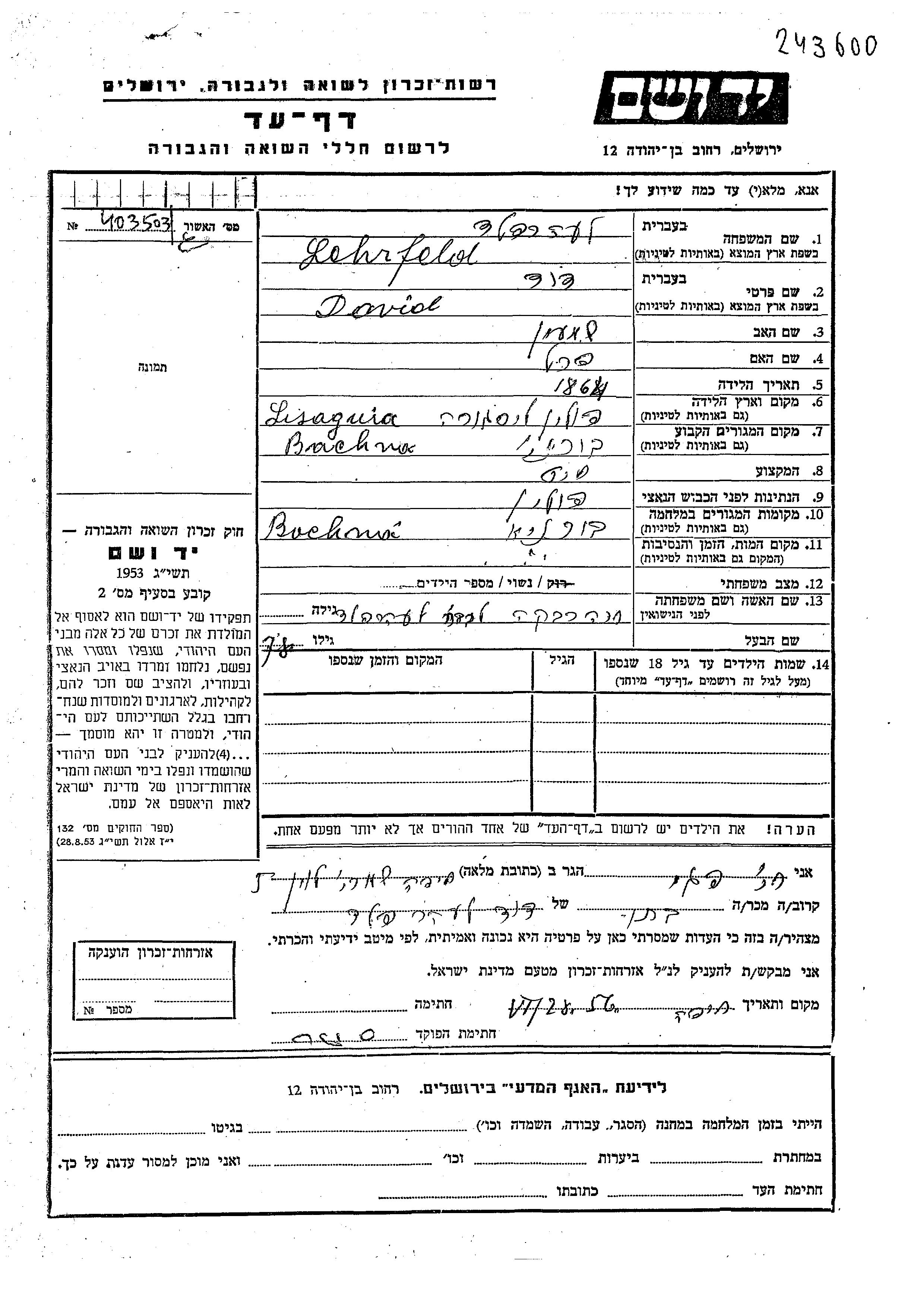 David Lehrfeld wurde im Jahr 1864 in Lisia Gora, Polen geboren. Er war der Sohn von Shimon und Perel. Er war Schneider und mit Khana Rivka, geb. Lerfeld Verheiratet. Vor dem Zweiten Weltkrieg lebte er in Bochnia, Polen. Während des Krieges war er in Bochnia, Polen.