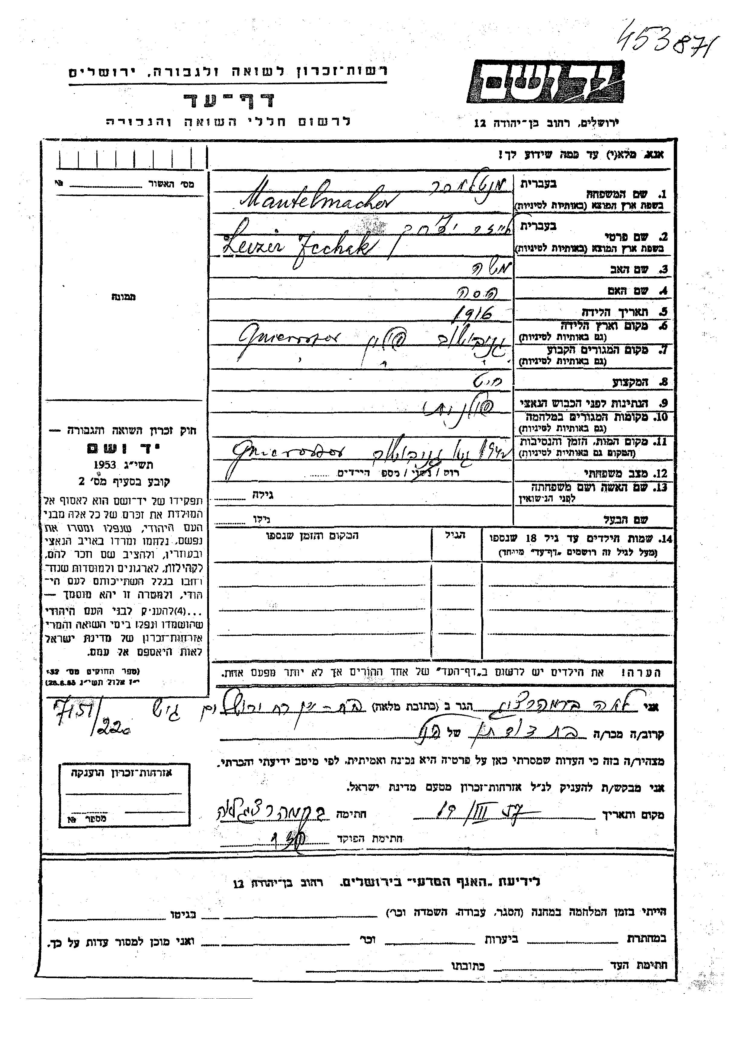 Icchak Leizer Mantelmacher wurde im Jahr 1916 in Gniewiszow, Polen geboren. Er war der Sohn von Moshe und Khasia. Er war Schneider und Ledig. Vor dem Zweiten Weltkrieg lebte er in Gniewiszow, Polen. Während des Krieges war er in Gniewiszow, Polen.