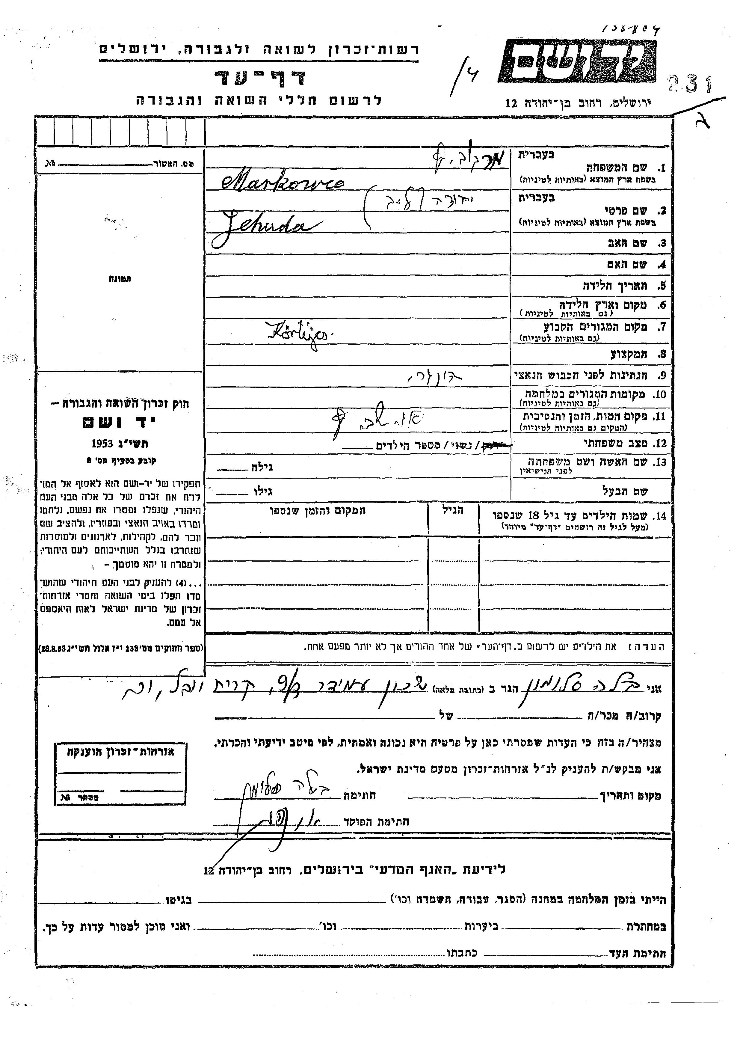Markowic Yehuda Leib Kortvejes, Ungarn Gedenkblatt