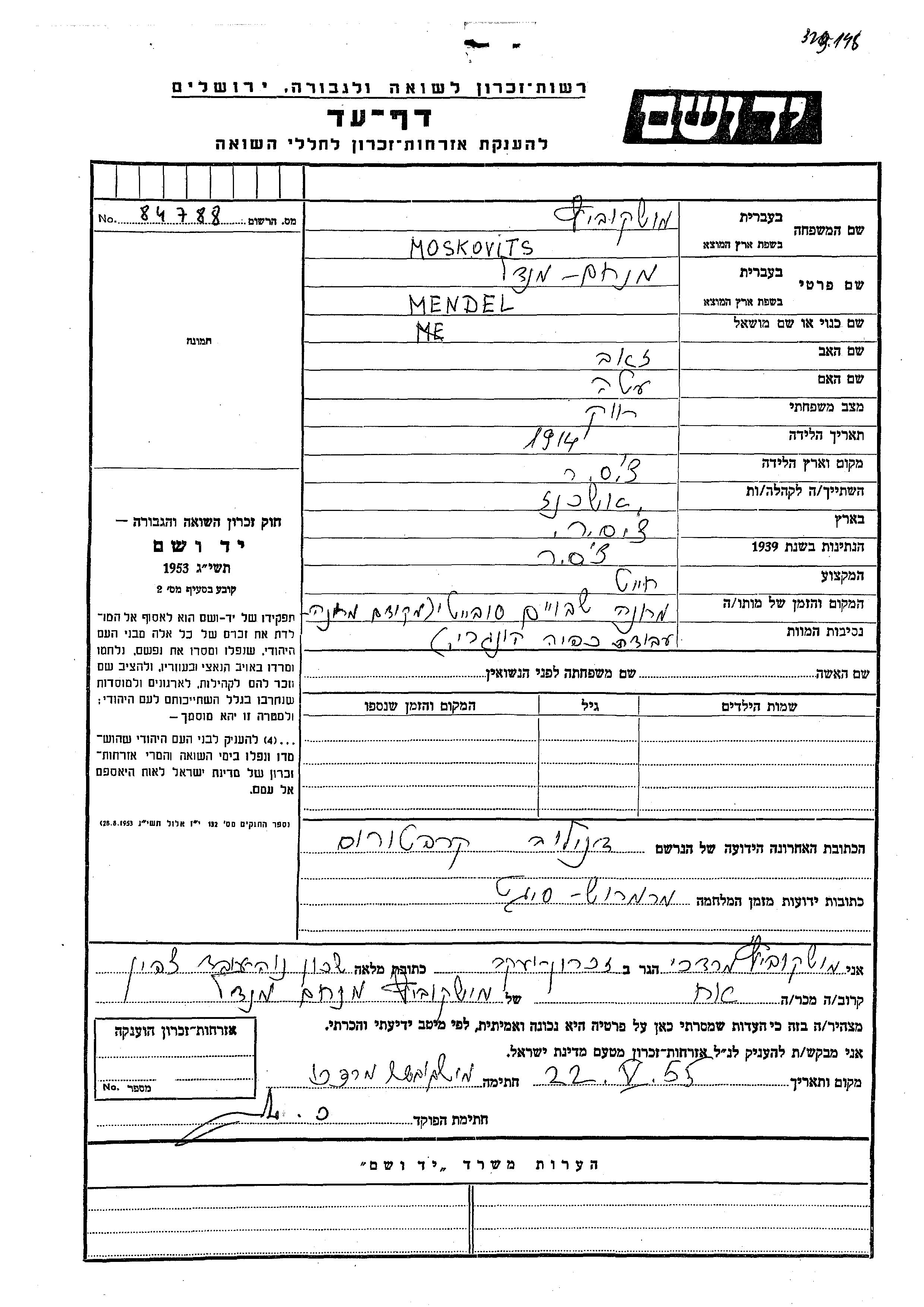 Mendel Menakhem Moskovits wurde im Jahr 1914 in Tschechoslowakei geboren. Er war der Sohn von Zeev und Ester. Er war Schneider und Ledig. Vor dem Zweiten Weltkrieg lebte er in Danilov, Tschechoslowakei. Während des Krieges war er in Siget, Rumänien.