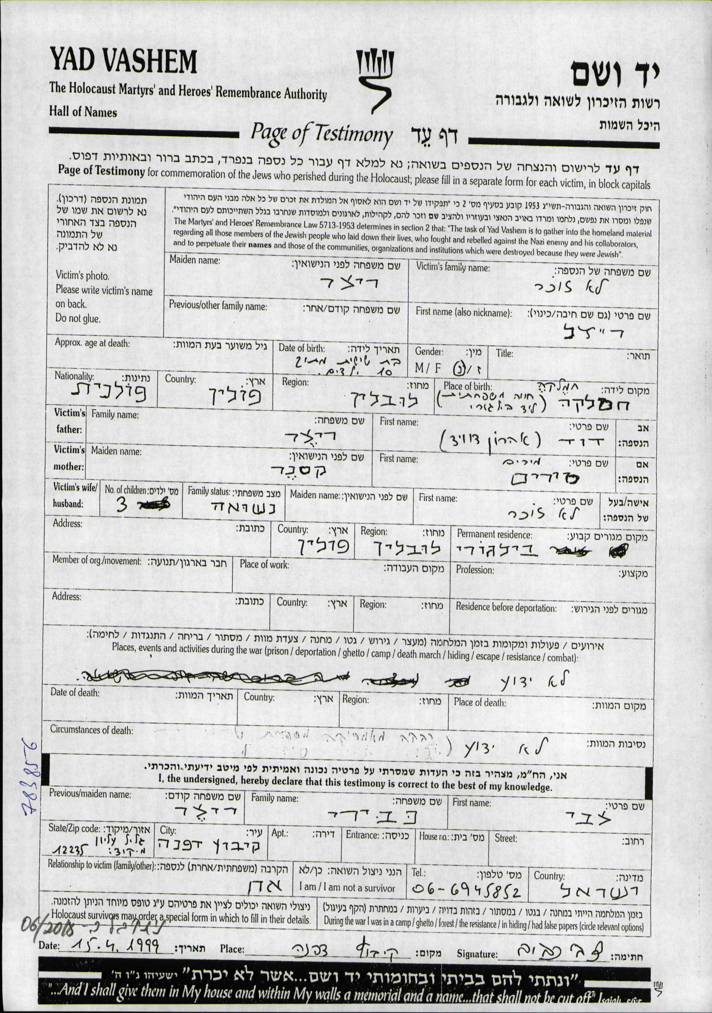 Reizl Name unbekannt, geb. Ritzer wurde in Chmielek, Polen geboren. Sie war die Tochter von David Aharon und Meirim, geb. Kasner. Sie war Verheiratet. Vor dem Zweiten Weltkrieg lebte sie in Bilgoraj, Polen.