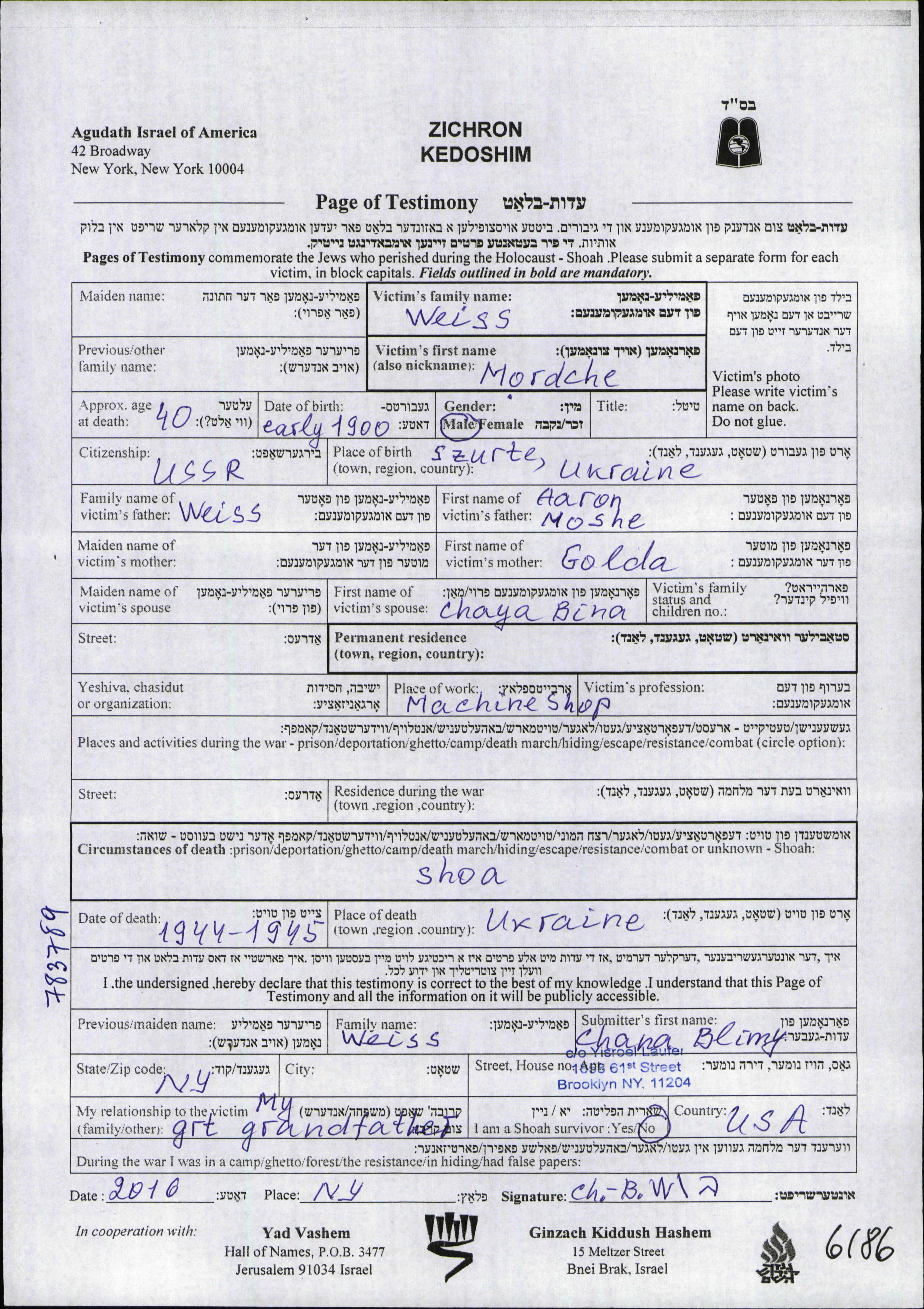 Mordche Weiss wurde im Jahr 1900 in Szurte, Tschechoslowakei geboren. Er war der Sohn von Aaron Moshe und Golda. Er war Maschinenhändler und mit Chaya Bina Verheiratet.