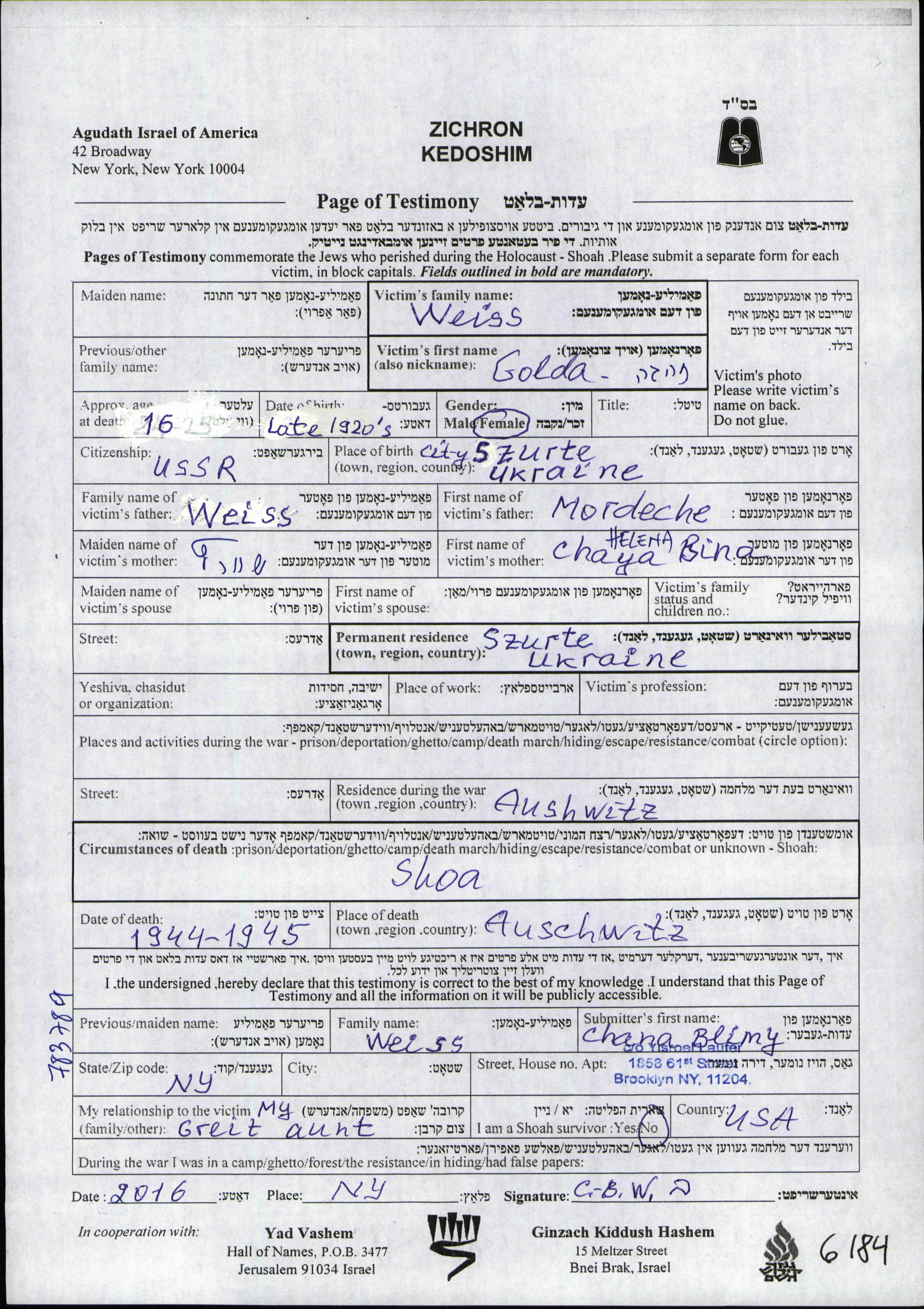 Golda Zahava wurde in der Schoah ermordet. Todesort: Auschwitz, Polen im Jahr 1944.