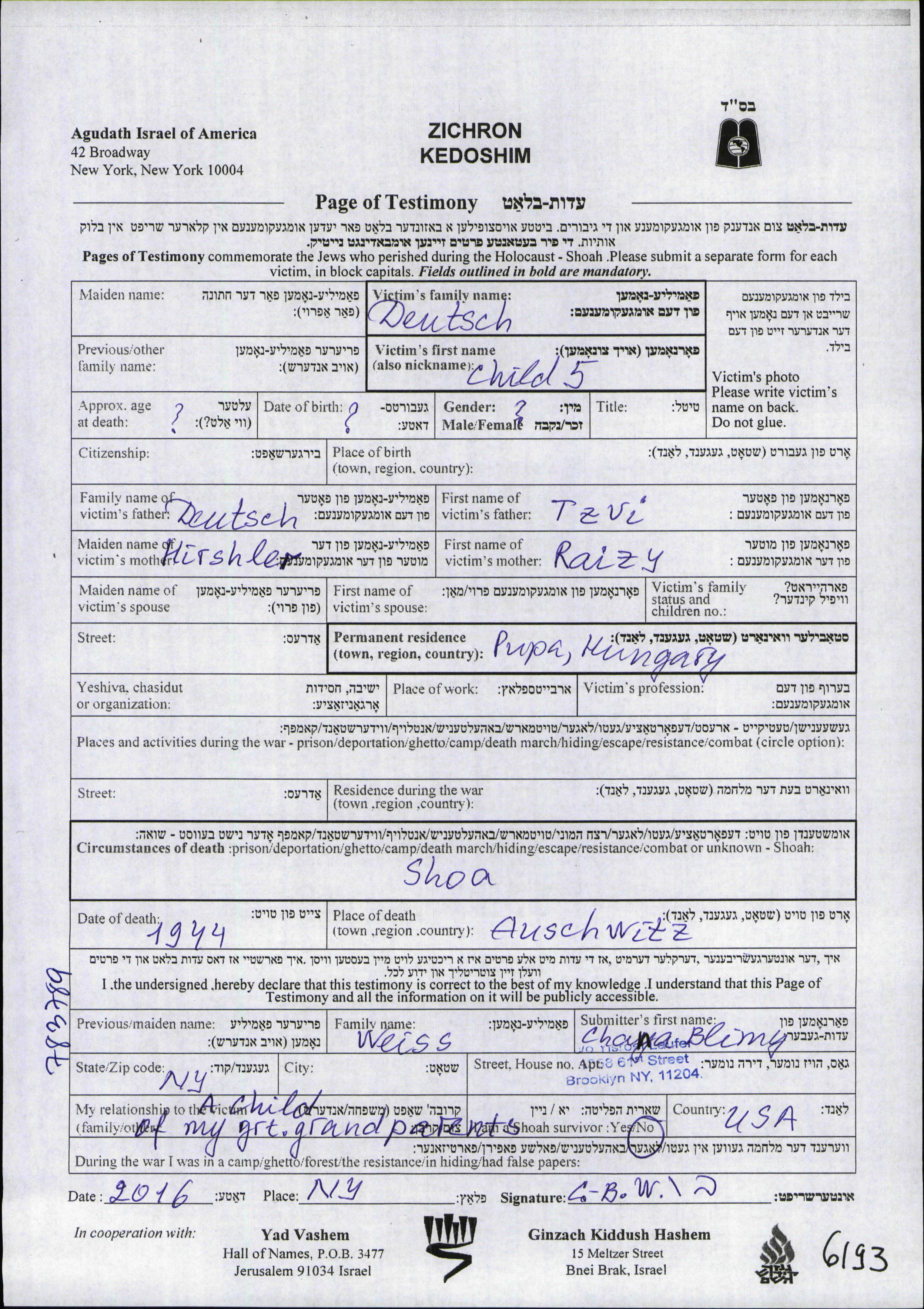 Vorname unbekannt Deutsch wurde Er/sie war der/ die Sohn/Tochter von Tzvi und Raizy, geb. Hirshler. Er/Sie war Kind. Vor dem Zweiten Weltkrieg er/sie in Papa, Ungarn.