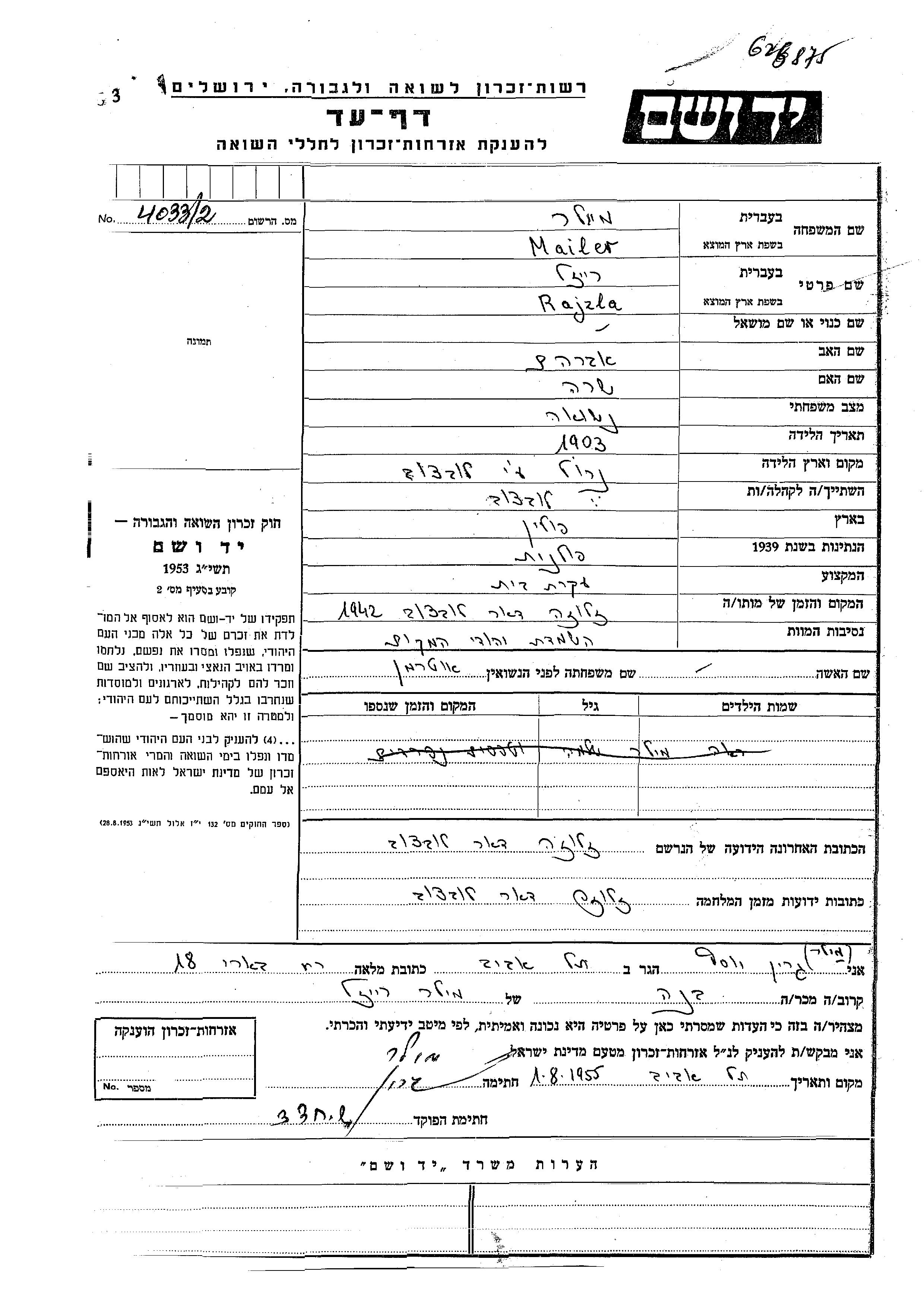 Rajsla Reizl Mailer, geb. Oterman wurde im Jahr 1903 in Narol, Polen geboren. Sie war die Tochter von Avraham und Sara. Sie war Hausfrau. Vor dem Zweiten Weltkrieg lebte sie in Narol, Polen. Während des Krieges war sie in Załuże, Polen.
