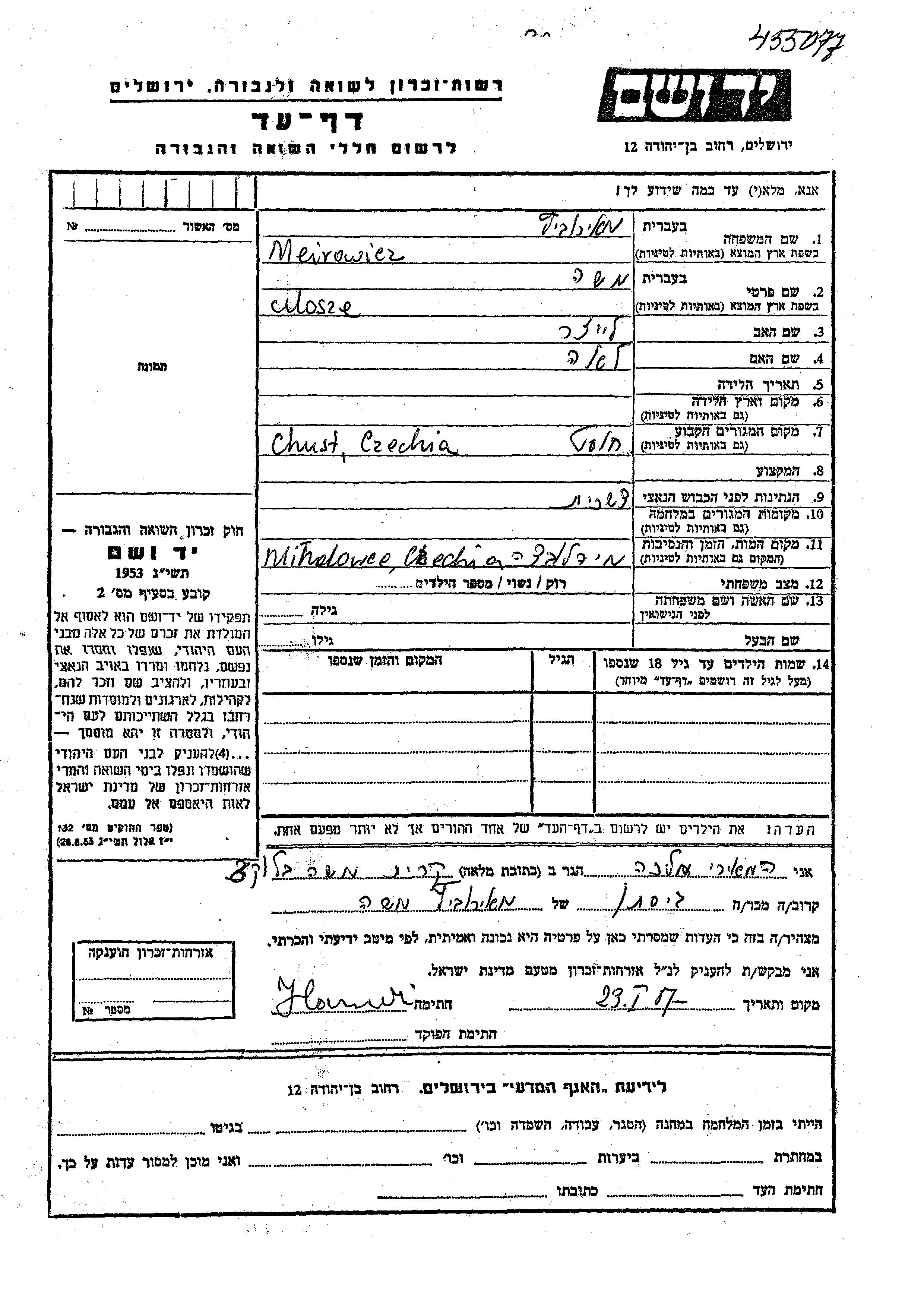Mosze Meirowicz wurde Er war der Sohn von Leizer und Lea. Vor dem Zweiten Weltkrieg lebte er in Hust, Tschechoslowakei.