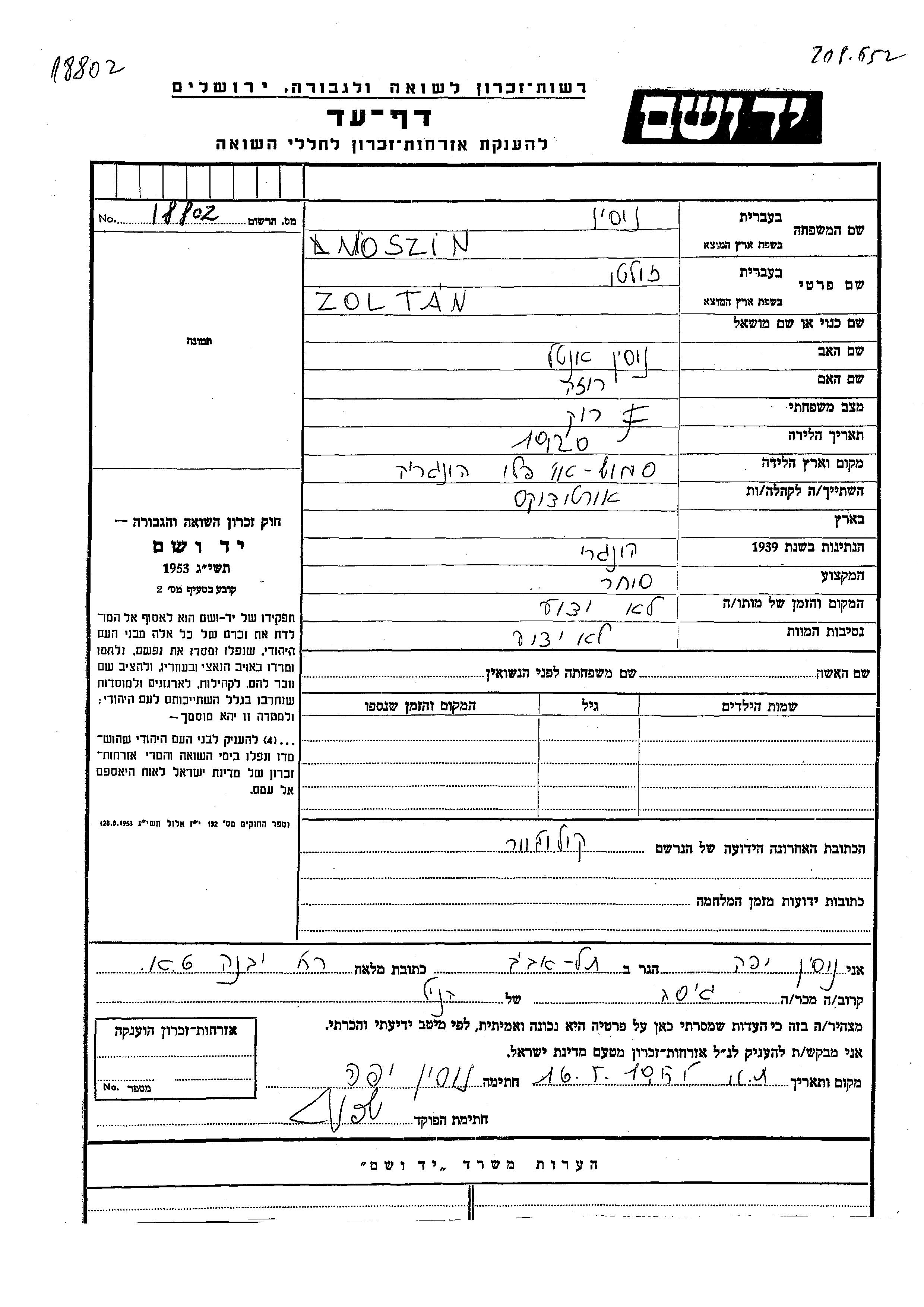Zoltan Noszin wurde im Jahr 1920 in Ujfalu, Rumänien geboren. Er war der Sohn von Antal Natan und Roza. Er war Kaufmann/-frau und Ledig. Vor dem Zweiten Weltkrieg lebte er in Koluzwar, Rumänien.