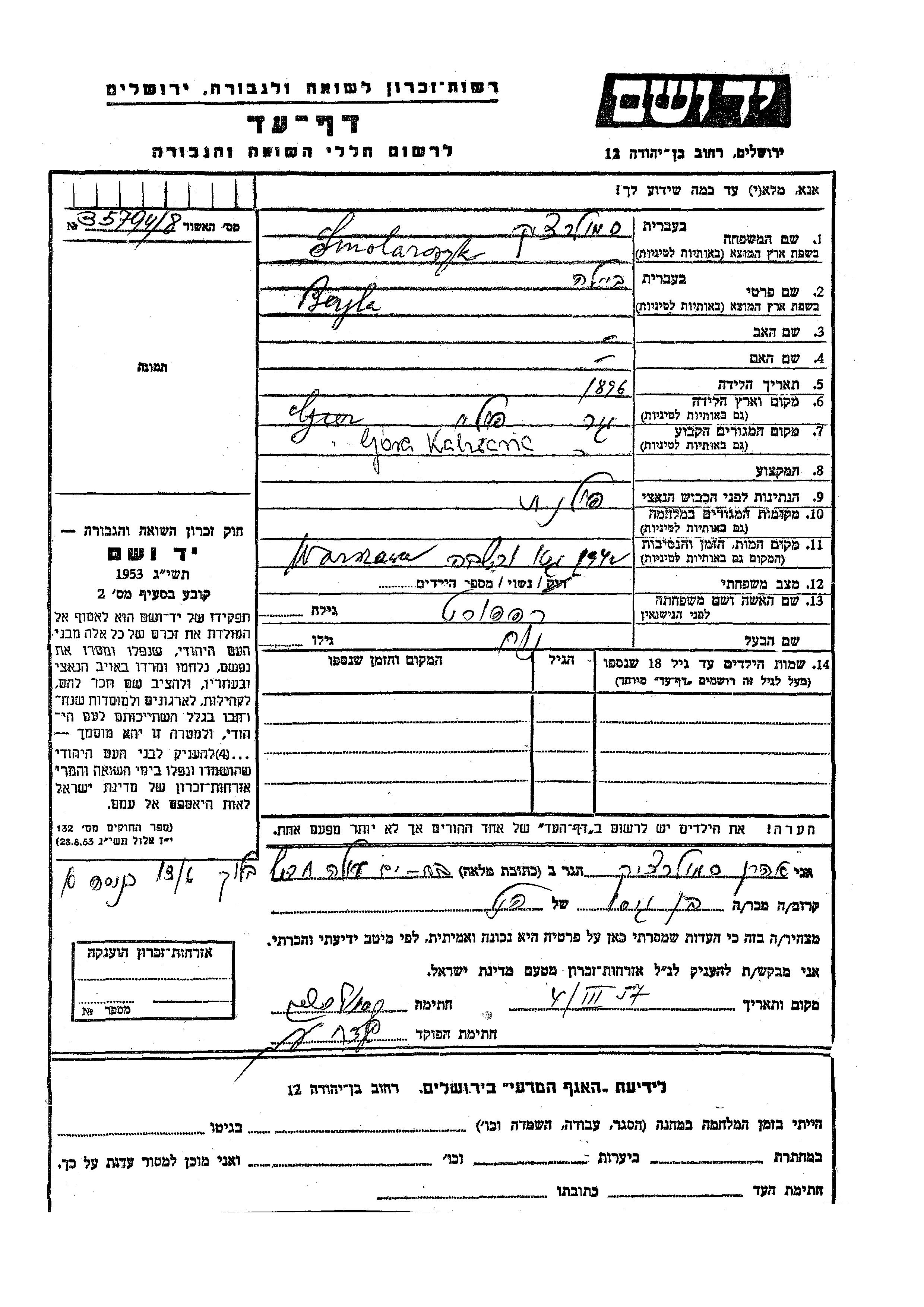 Bajla Smolarczyk, geb. Rapaport wurde im Jahr 1896 in Gur, Polen geboren. Sie war mit Noakh Verheiratet. Vor dem Zweiten Weltkrieg lebte sie in Gora Kalwaria, Polen. Während des Krieges war sie in Polen.