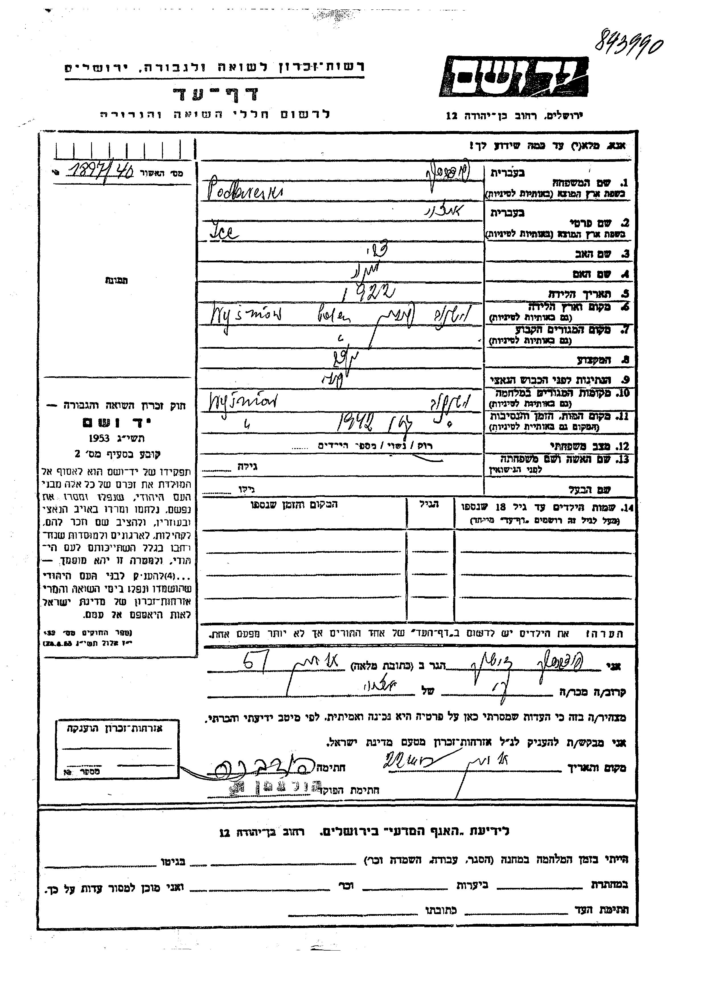 Ice Podbareski wurde im Jahr 1922 in Wyszniow, Polen geboren. Er war der Sohn von Tzvi und Mina. Er war Ledig. Vor dem Zweiten Weltkrieg lebte er in Wyszniow, Polen. Während des Krieges war er in Wyszniow, Polen.