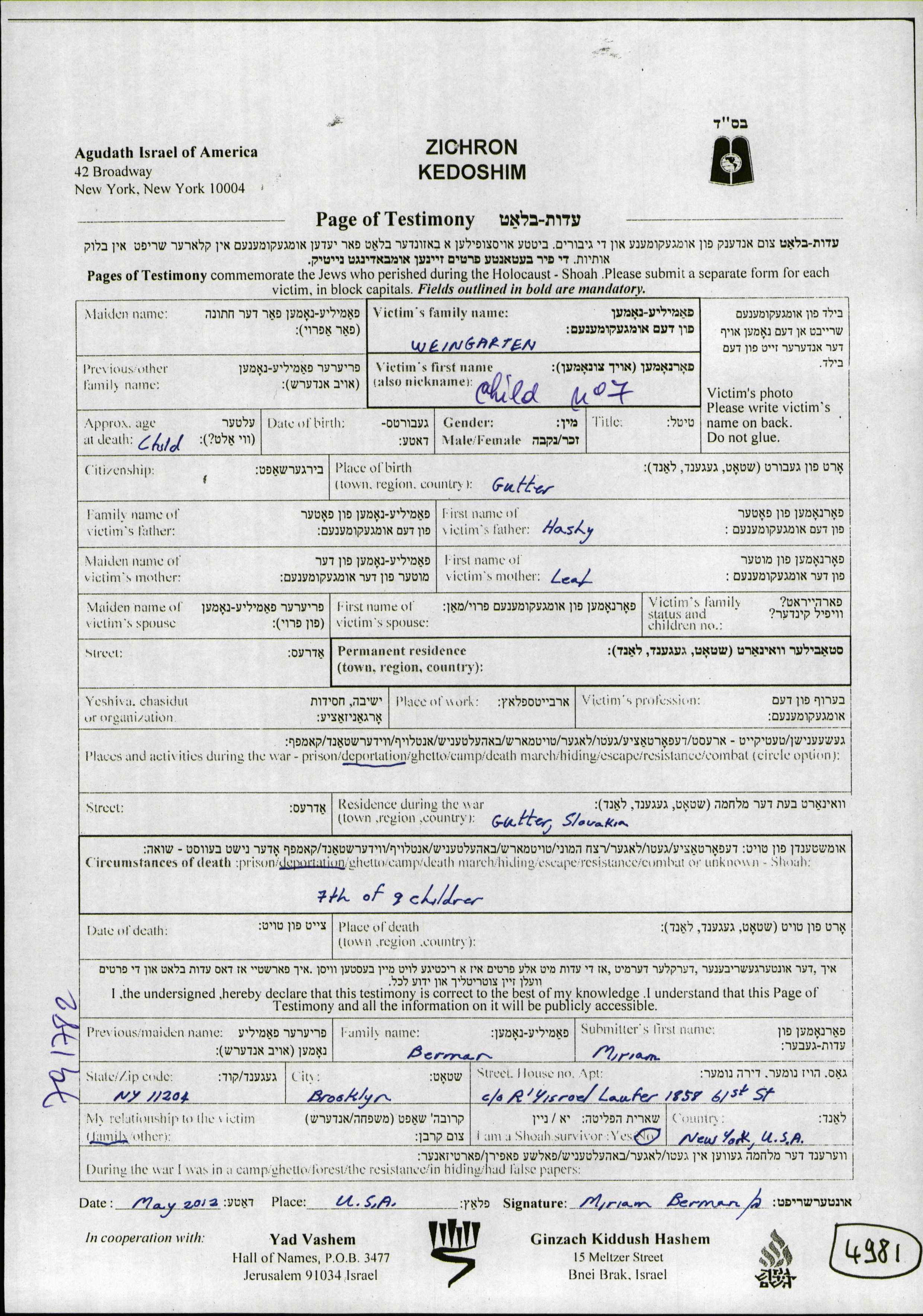 Vorname unbekannt Weingarten wurde in Gutor, Tschechoslowakei geboren. Er/sie war der/ die Sohn/Tochter von Hashy und Leah, geb. Cohen. Er/Sie war Kind. Während des Krieges war er/sie in Gutor, Tschechoslowakei.