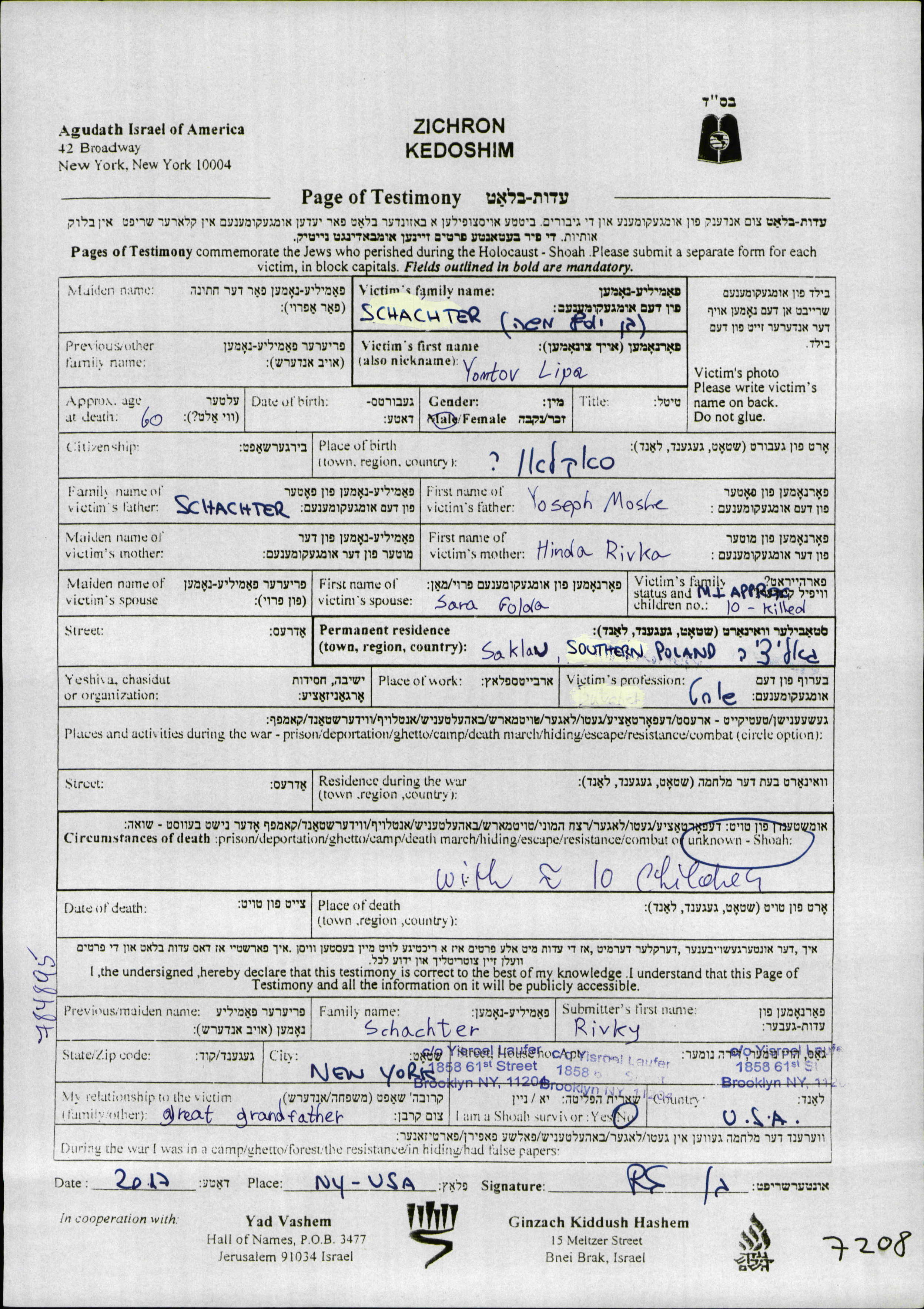 Yomtov Lipa Schachter wurde in Sokolow, Polen geboren. Er war der Sohn von Yoseph Moshe und Hinda Rivka. Er war Schächter und mit Sara Golda Verheiratet. Vor dem Zweiten Weltkrieg lebte er in Sokolow, Polen.