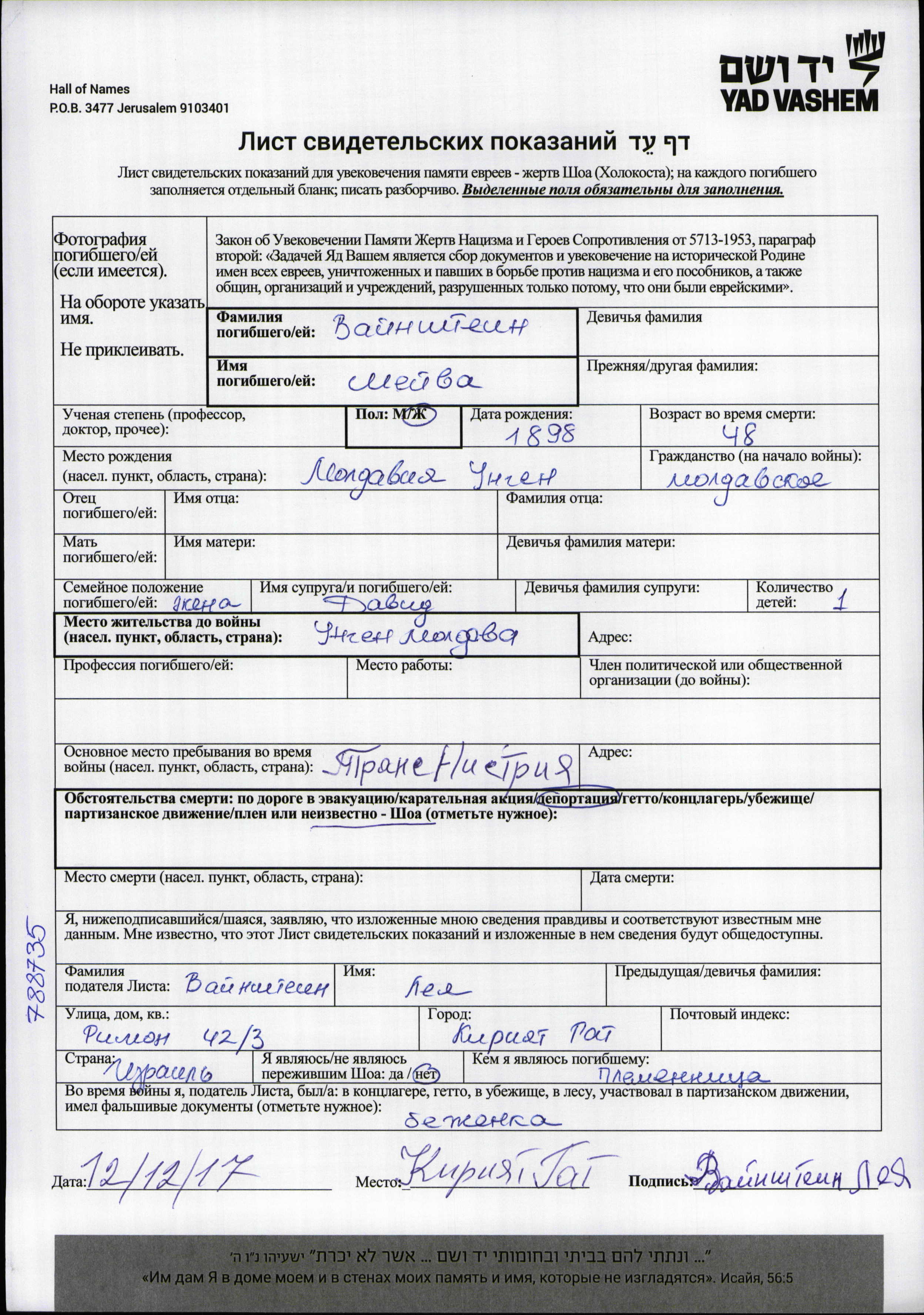 Sheyva Vaynshtein wurde im Jahr 1898 in Ungen, Rumänien geboren. Sie war mit David Verheiratet. Vor dem Zweiten Weltkrieg lebte sie in Ungen, Rumänien. Während des Krieges war sie in Transnistria, Ukraine (UdSSR).