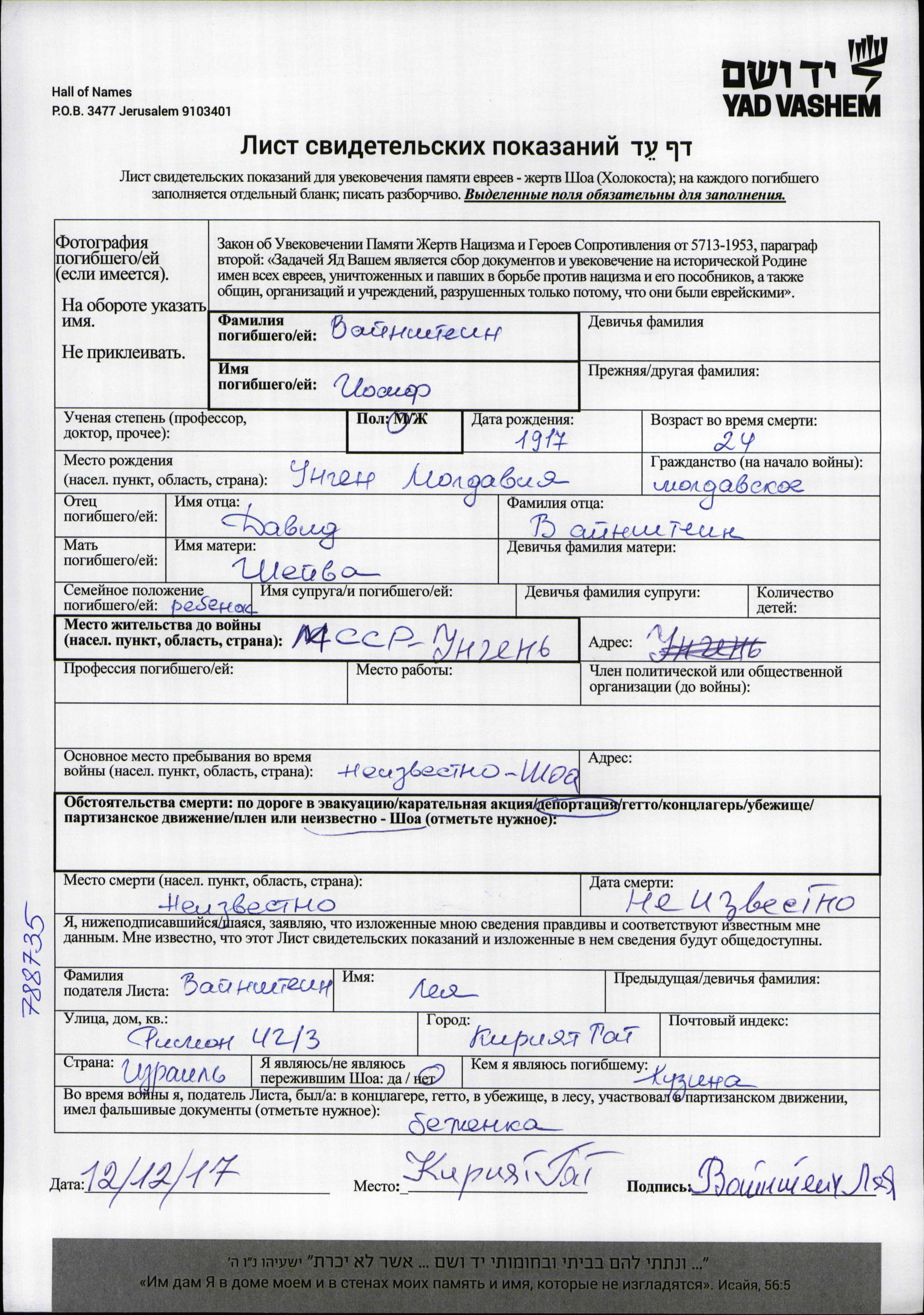 Iosif Vaynshtein wurde im Jahr 1917 in Ungen, Rumänien geboren. Er war der Sohn von David und Sheyva. Vor dem Zweiten Weltkrieg lebte er in Ungen, Rumänien.