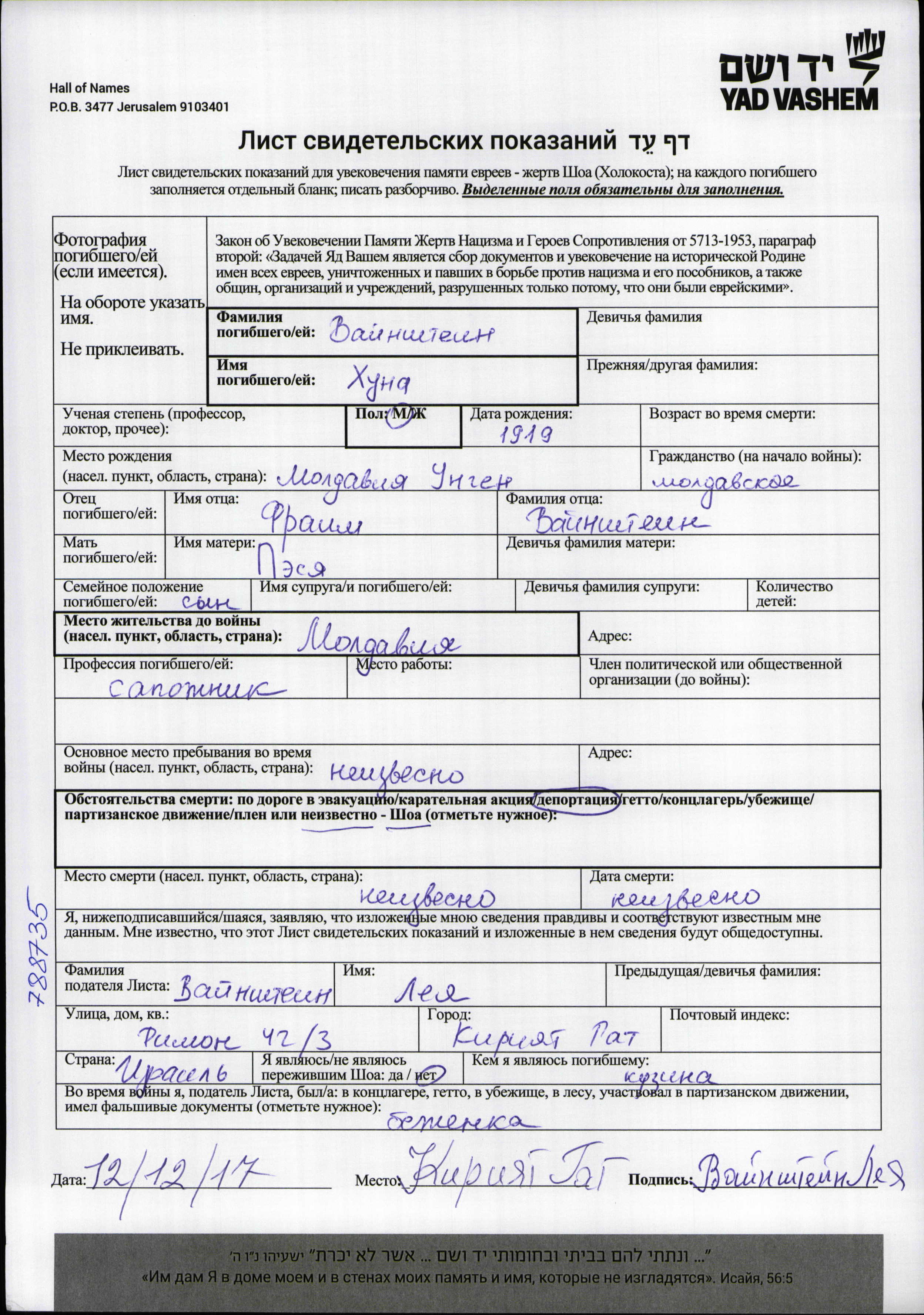 Khuna Vaynshtein wurde im Jahr 1919 in Ungen, Rumänien geboren. Er war der Sohn von Fraim und Pesya. Er war Schuster/-in. Vor dem Zweiten Weltkrieg lebte er in Moldavia, Rumänien.