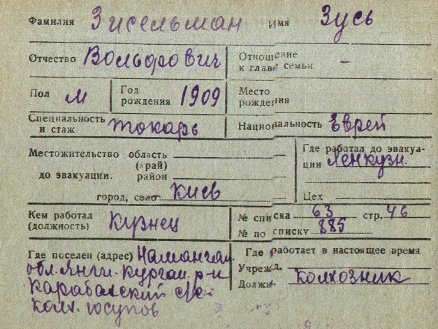 Ziselman | Zus | 1909 | Kiyev, Ukraine (UdSSR) | Evakuiertenliste |
