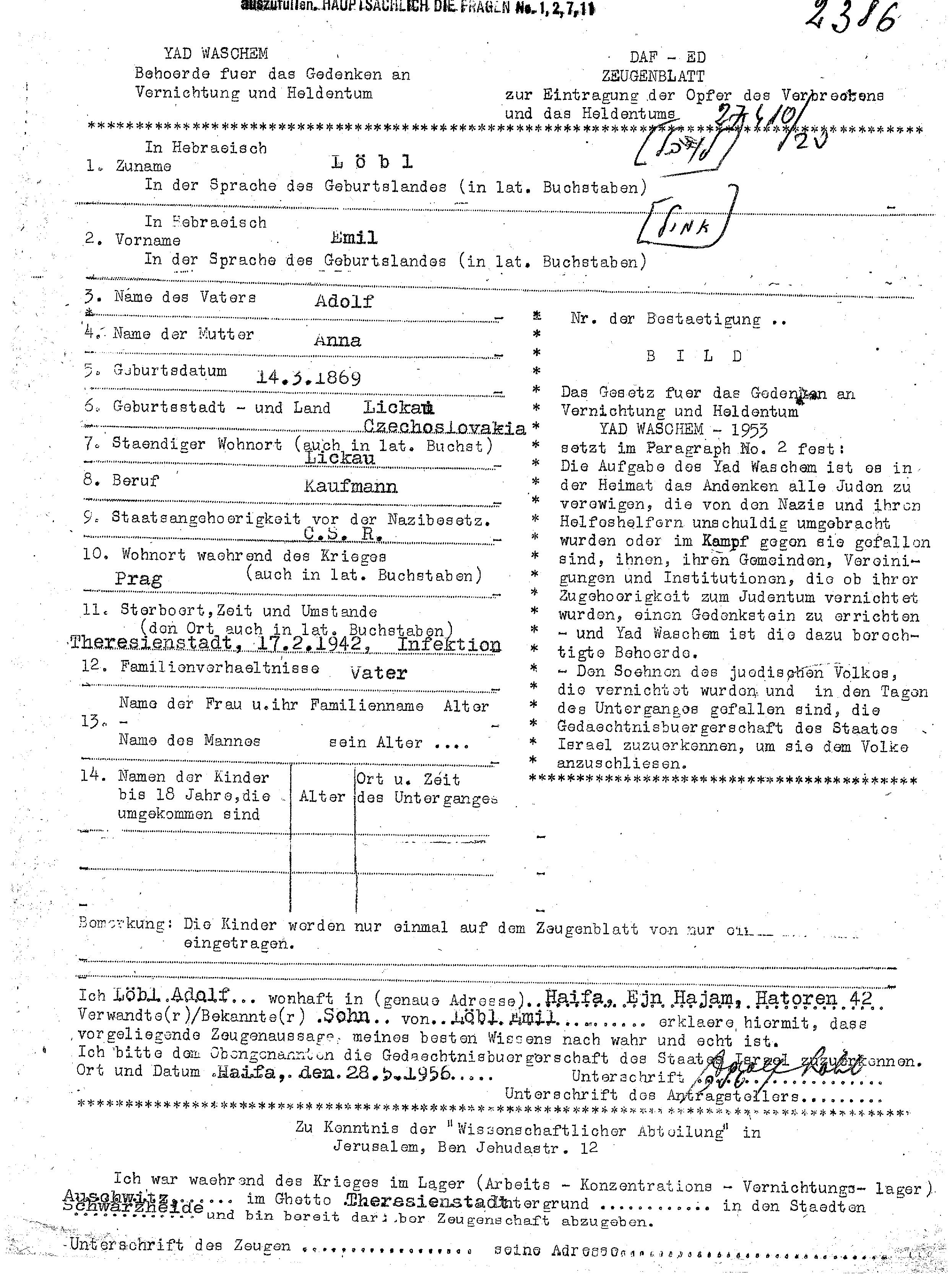 Löbl Emil 1869 Haeftlingsliste des Lagers Theresienstadt