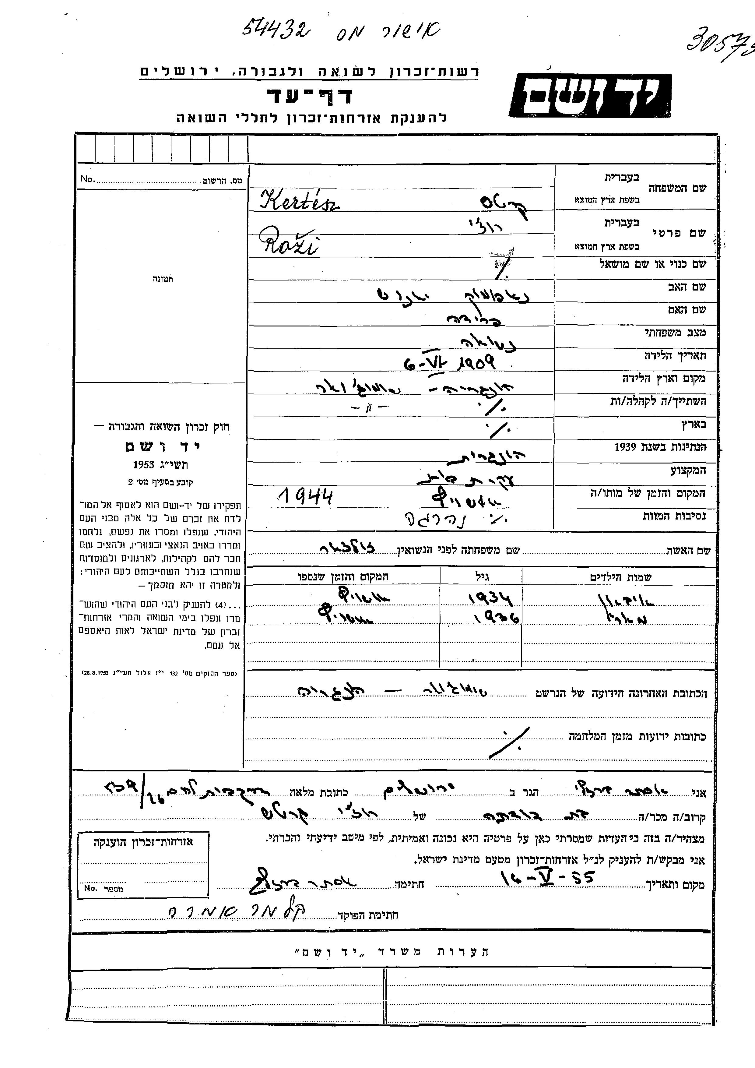 Rozi Kertesz, geb. Zeltzer wurde im Jahr 1909 in Somogyvar, Ungarn geboren. Sie war die Tochter von Yan und Frida. Sie war Hausfrau und Verheiratet. Vor dem Zweiten Weltkrieg lebte sie in Somogyvar, Ungarn. Während des Krieges war sie in Somogyvar, Ungarn.