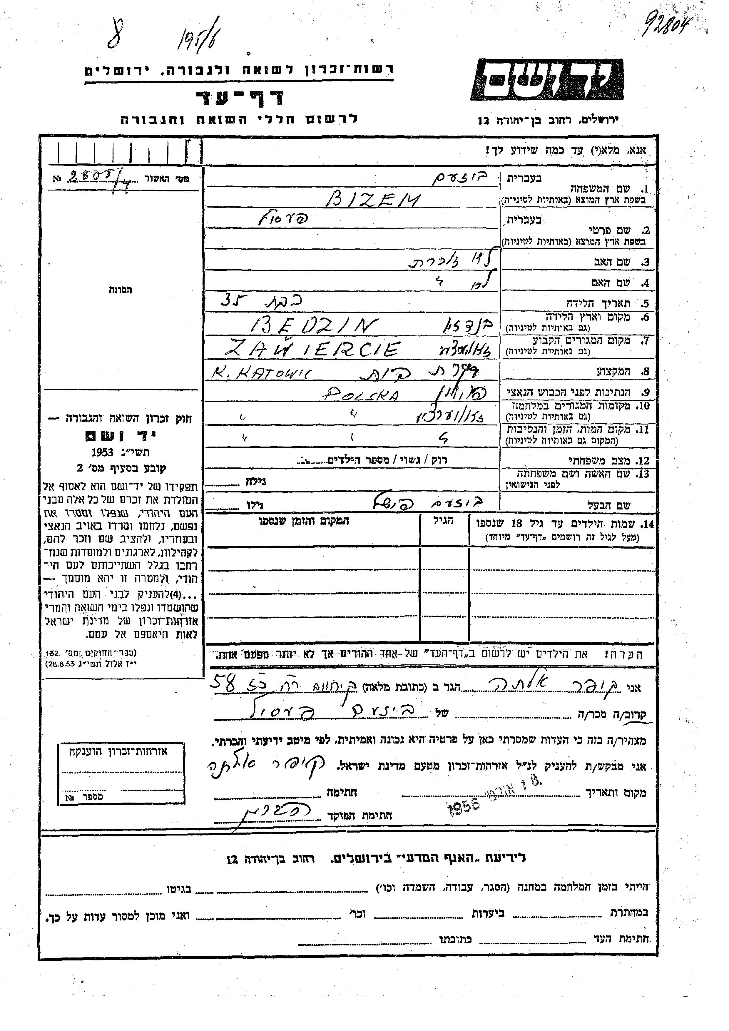 Beisem Pesil Zawiercie, Polen Gedenkblatt