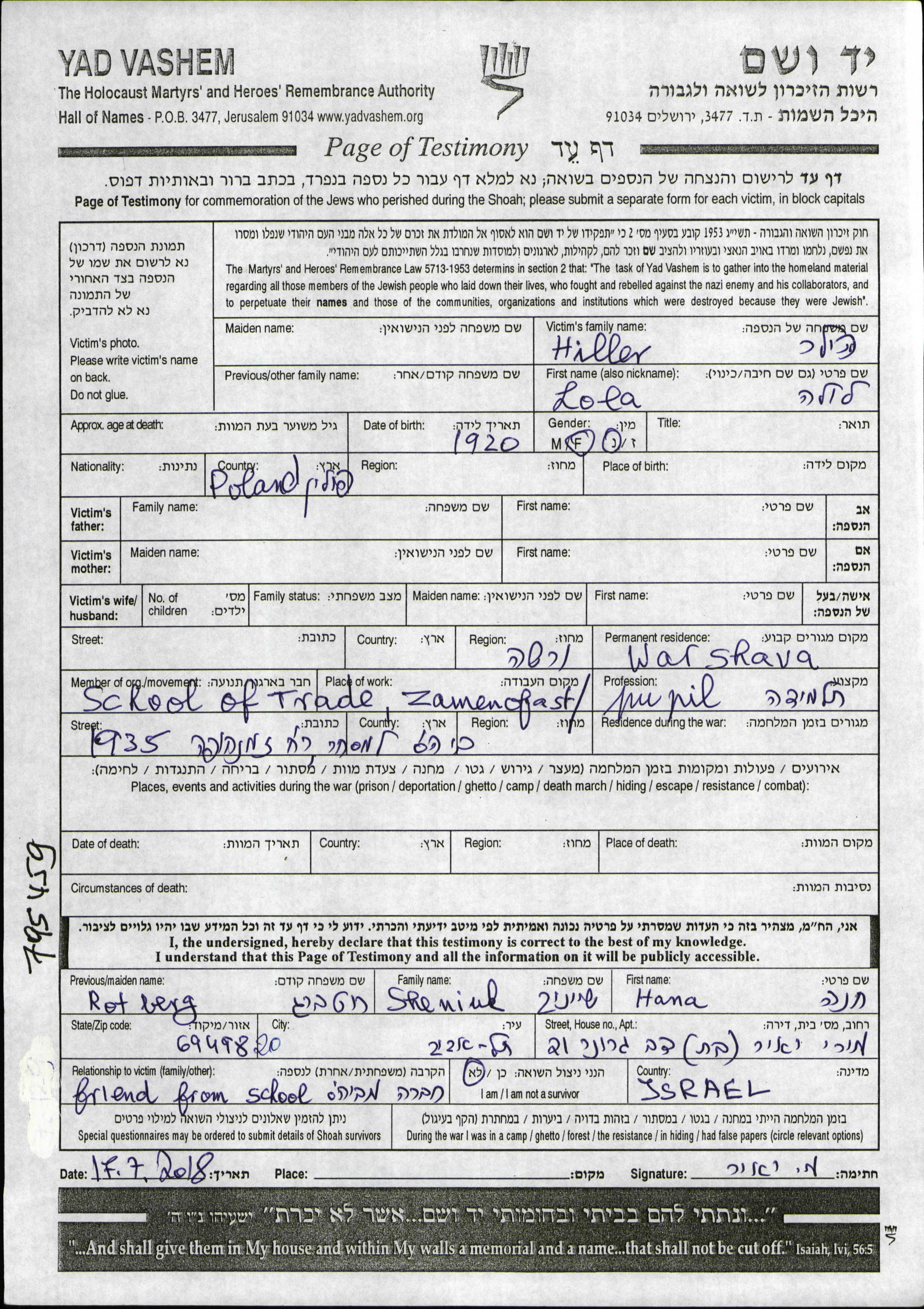 Lola Hiller wurde im Jahr 1920 in Polen geboren. Sie war Schüler/-in. Vor dem Zweiten Weltkrieg lebte sie in Warszawa, Polen.
