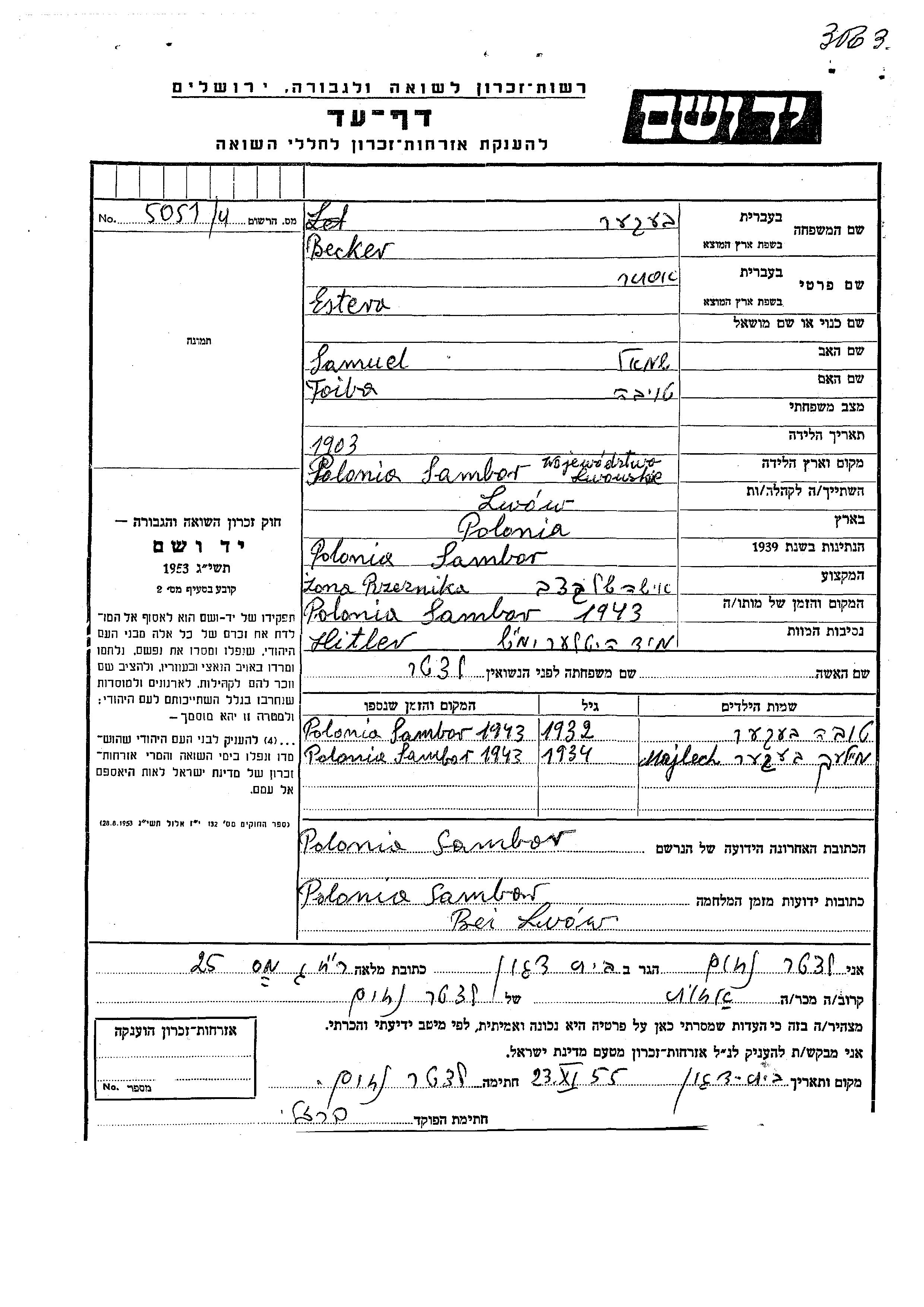 Estera Becker, geb. Letzter wurde im Jahr 1903 in Sambor, Polen geboren. Sie war die Tochter von Shmuel und Toiba. Sie war Verheiratet. Vor dem Zweiten Weltkrieg lebte sie in Sambor, Polen. Während des Krieges war sie in Sambor, Polen.
