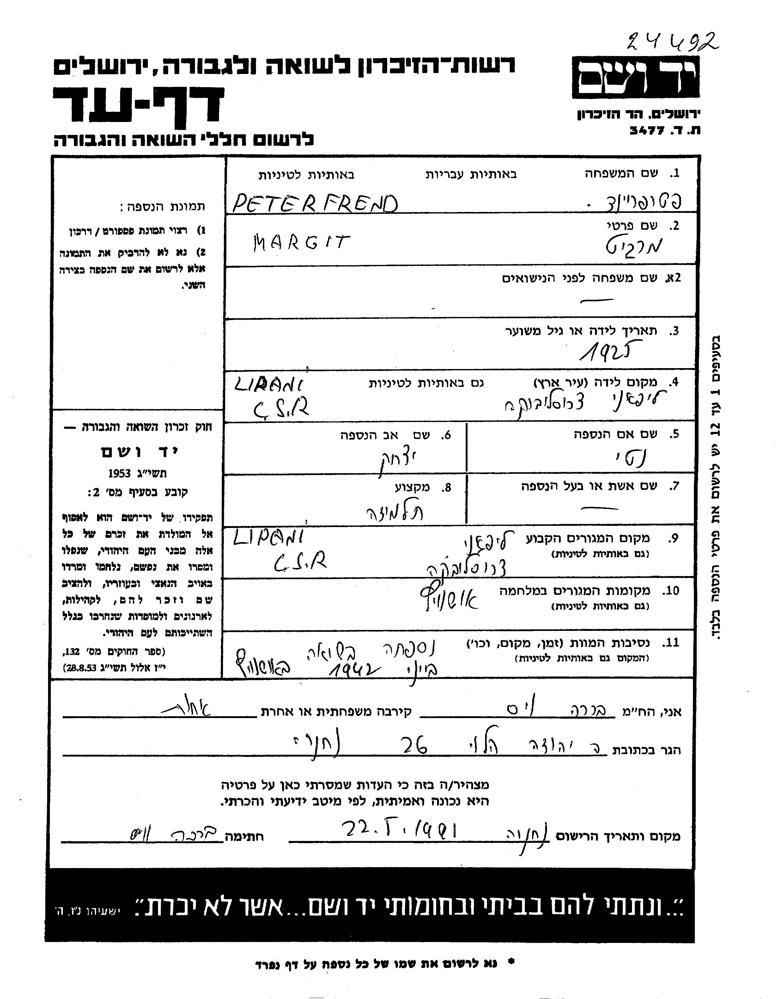 Peterfreund Margit Lipiany, Tschechoslowakei Gedenkblatt