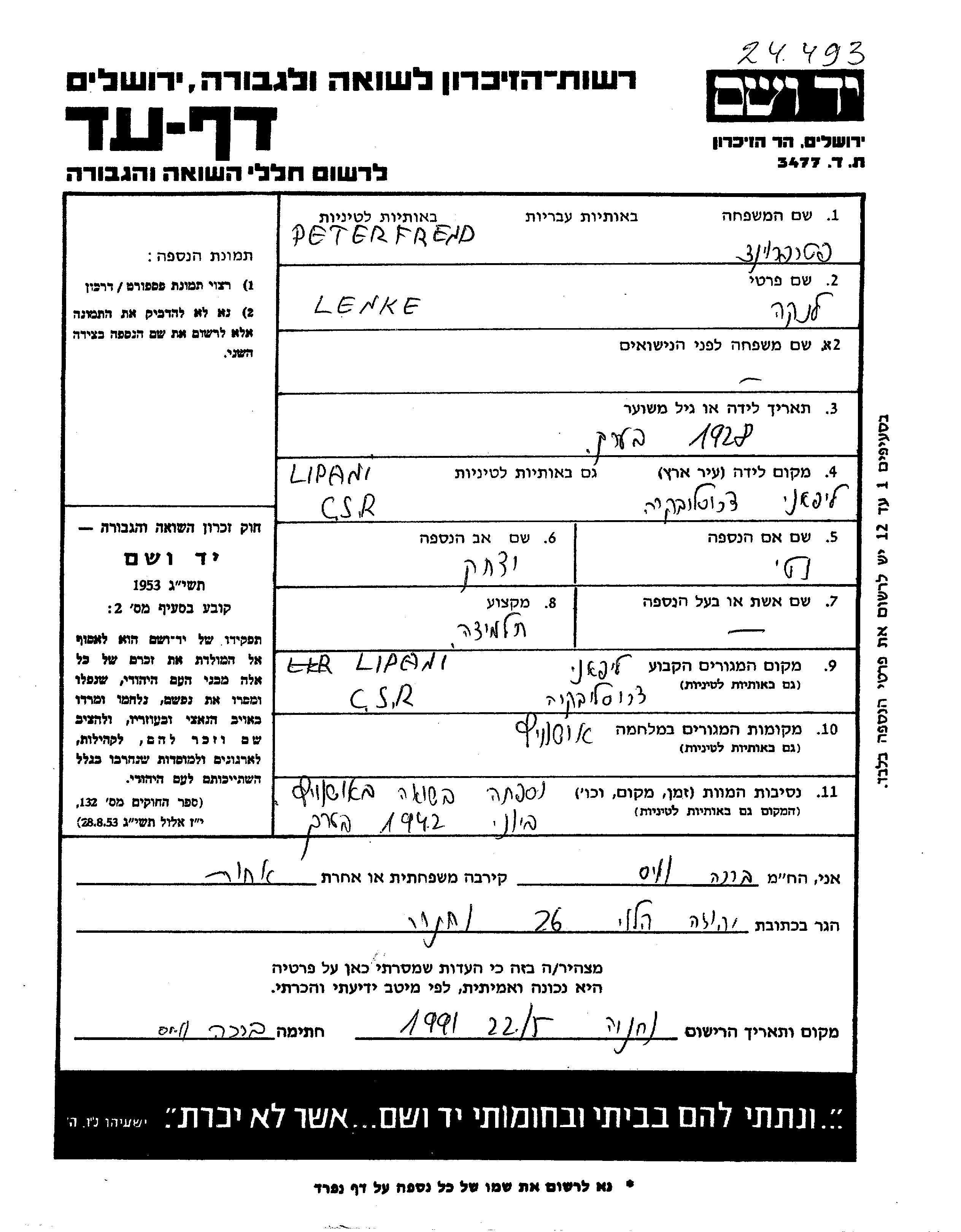 Lenke Peterfreund wurde im Jahr 1928 in Lipiany, Tschechoslowakei geboren. Sie war Schüler/-in. Vor dem Zweiten Weltkrieg lebte sie in Lipiany, Tschechoslowakei.