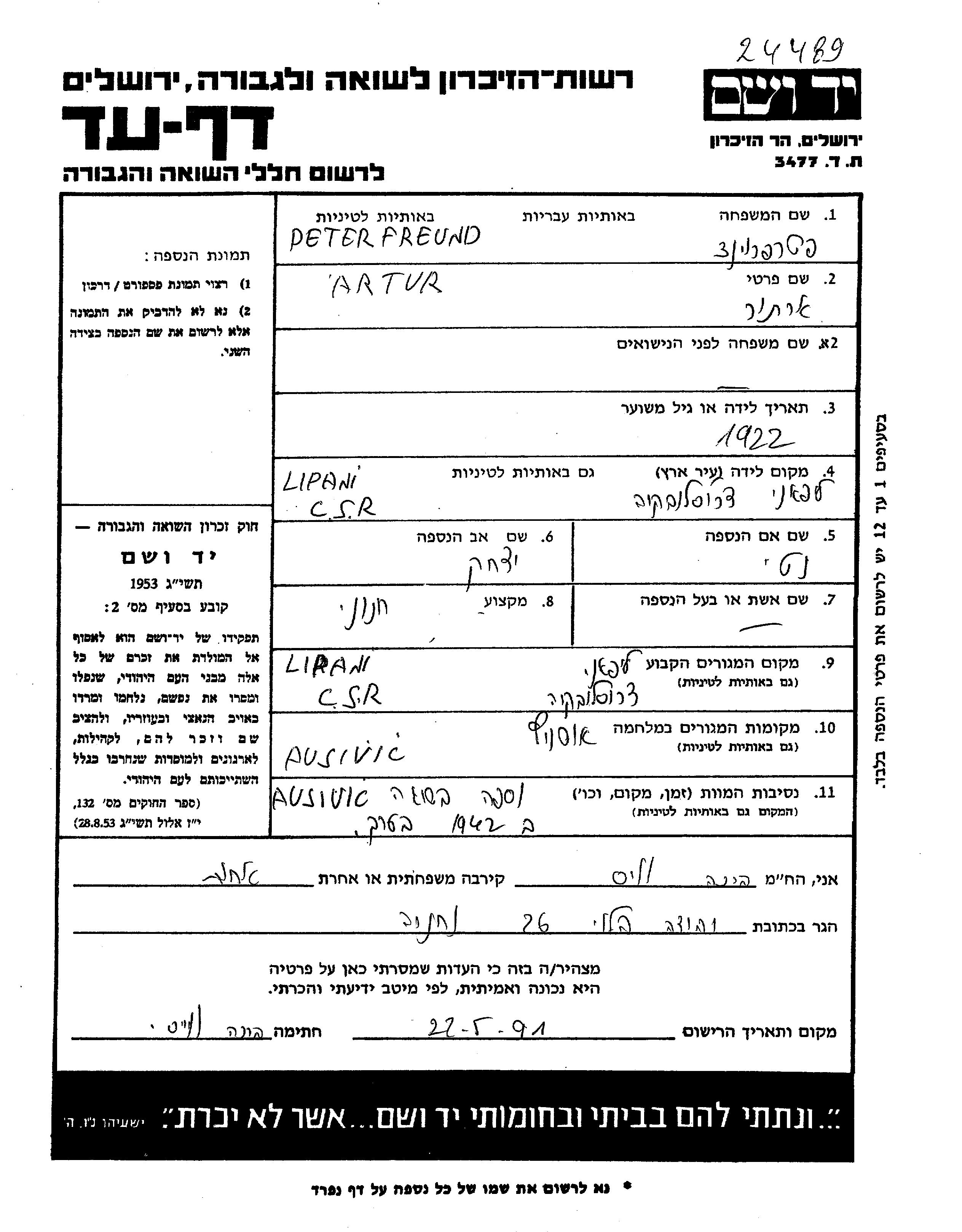 Peterfreund Arthur 1922 Lipiany, Tschechoslowakei Verfolgtenliste