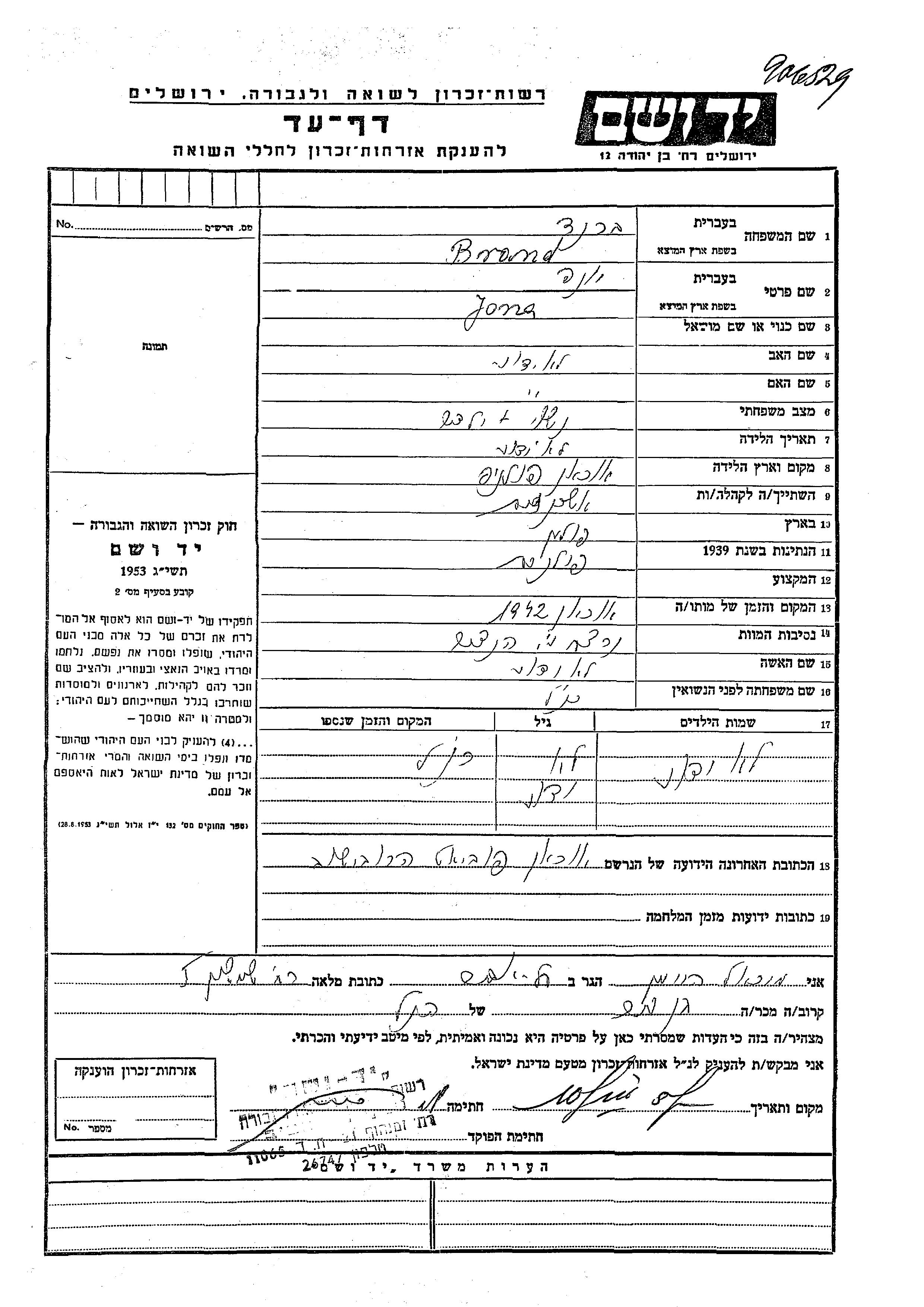Jona Brand wurde in Uchan, Polen geboren. Er war Verheiratet. Vor dem Zweiten Weltkrieg lebte er in Uchan, Polen. Während des Krieges war er in Uchan, Polen.