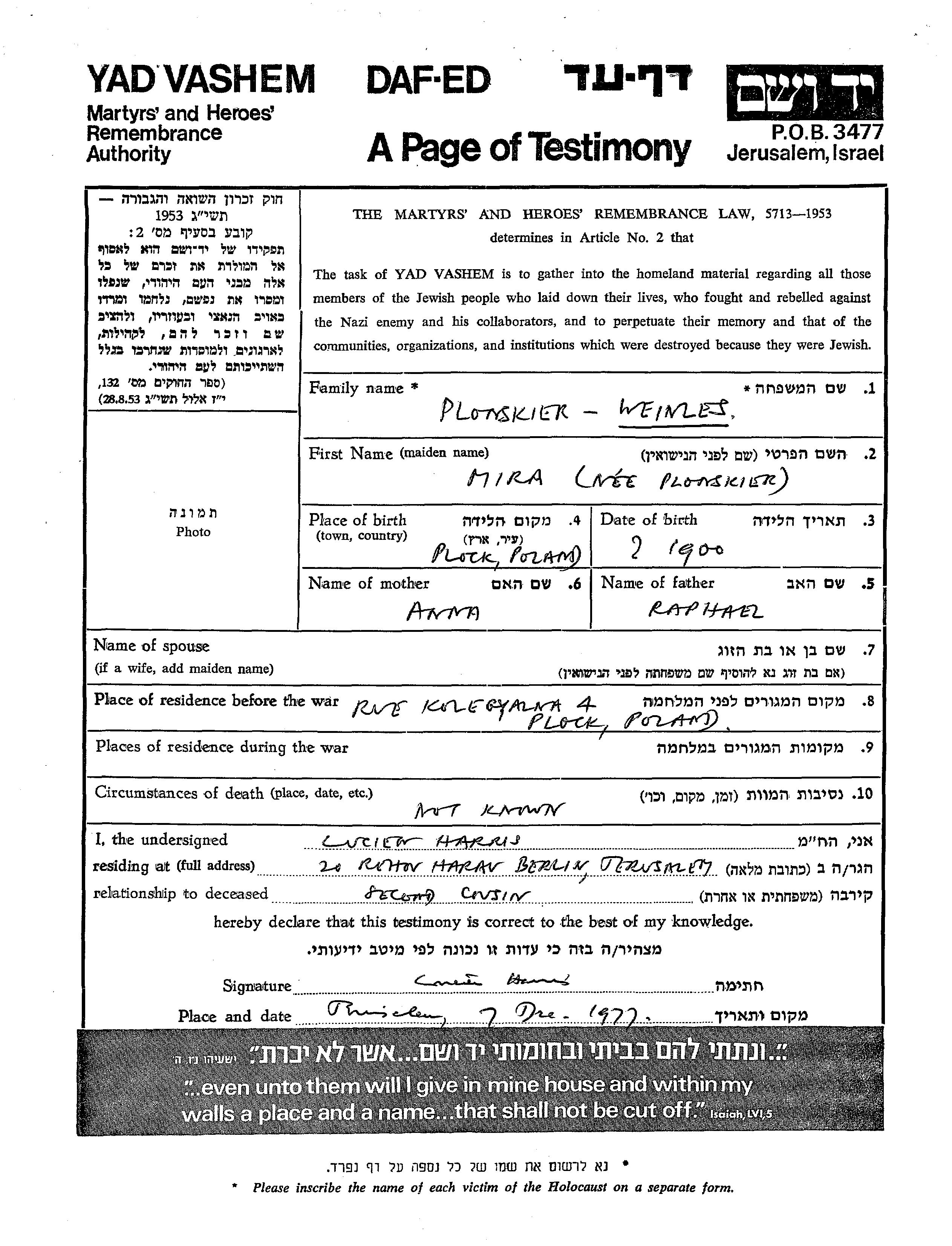 Mira Weinles, geb. Plonskier wurde im Jahr 1900 in Plock, Polen geboren. Vor dem Zweiten Weltkrieg lebte sie in Plock, Polen.