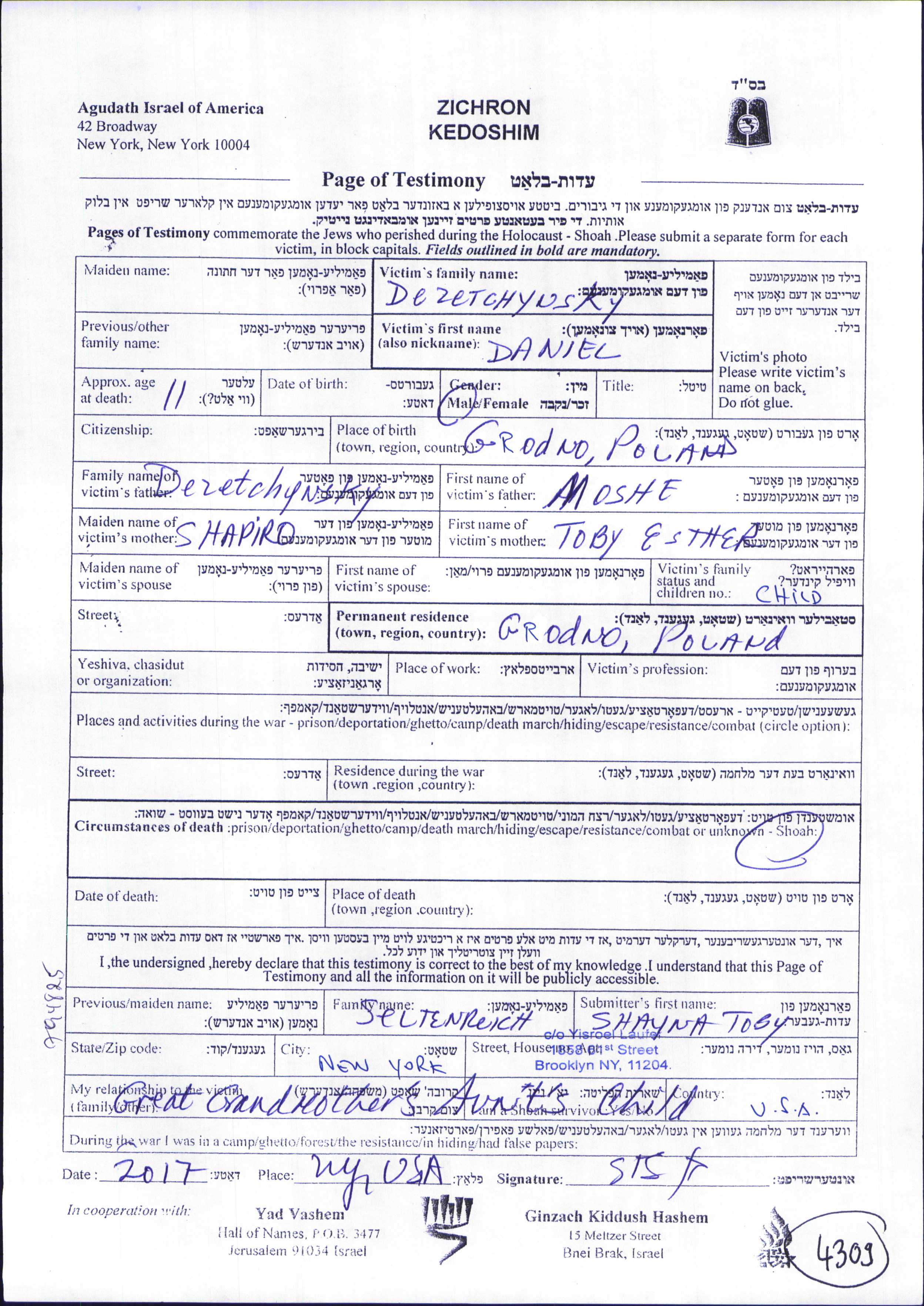 Daniel Deretchynsky wurde in Grodno, Polen geboren. Er war der Sohn von Moshe und Toby Esther, geb. Shapiro. Er war Kind. Vor dem Zweiten Weltkrieg lebte er in Grodno, Polen.
