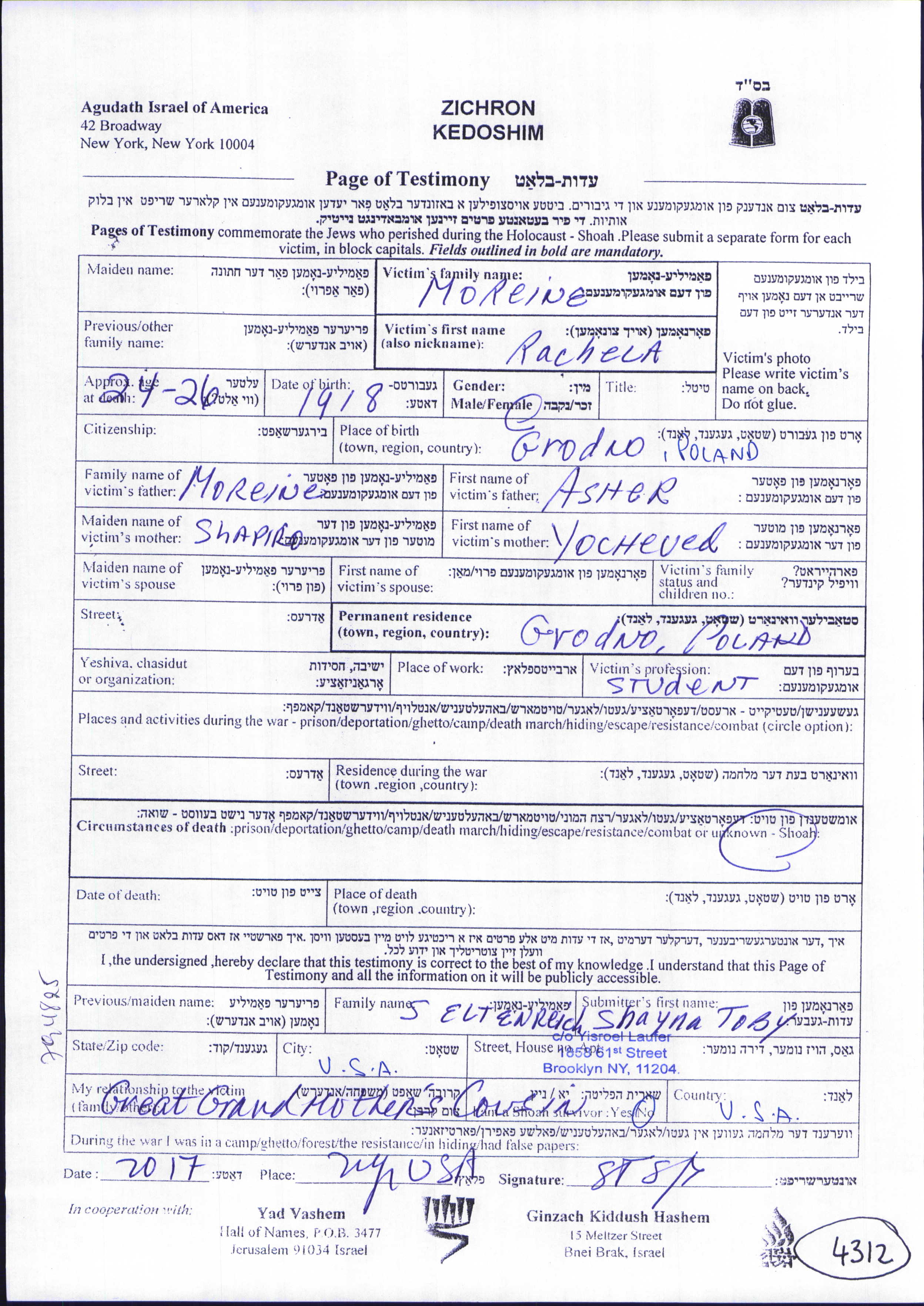Rachela Moreine wurde im Jahr 1918 in Grodno, Polen geboren. Sie war die Tochter von Asher und Yocheved, geb. Shapiro. Sie war Student. Vor dem Zweiten Weltkrieg lebte sie in Grodno, Polen.