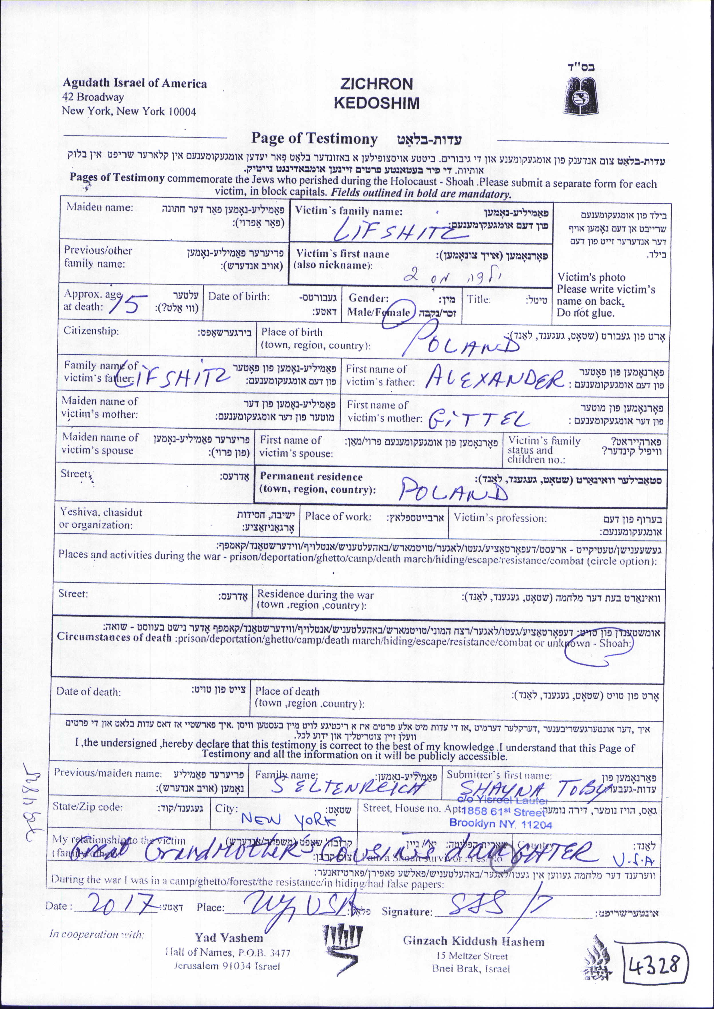 Vorname unbekannt Lifshitz wurde in Polen geboren. Sie war die Tochter von Alexander und Gittel. Sie war Jugendliche/-r. Vor dem Zweiten Weltkrieg lebte sie in Polen.