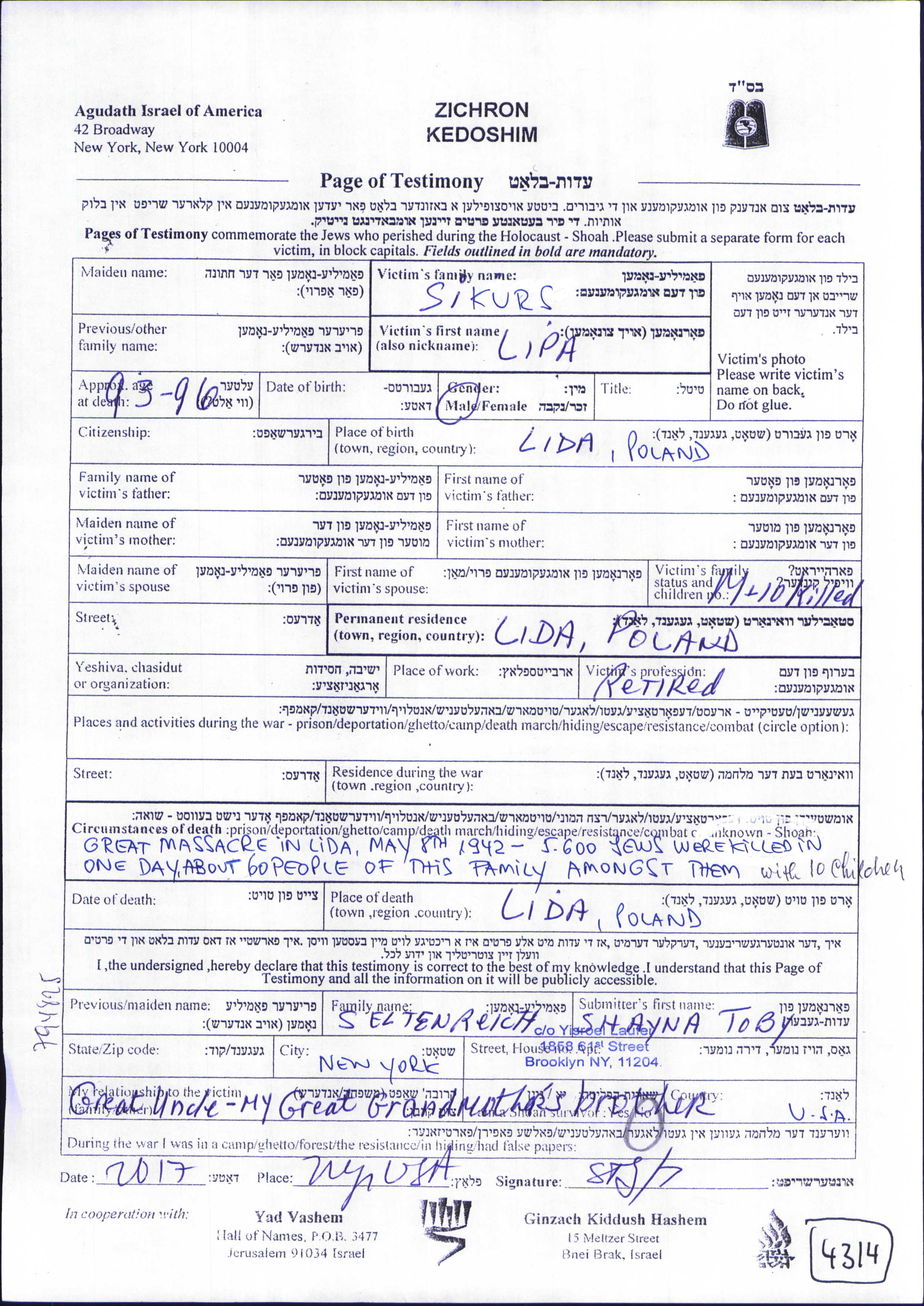 Lipa wurde in der Schoah ermordet. Todesort: Lida, Polen im Jahr 08/05/1942.