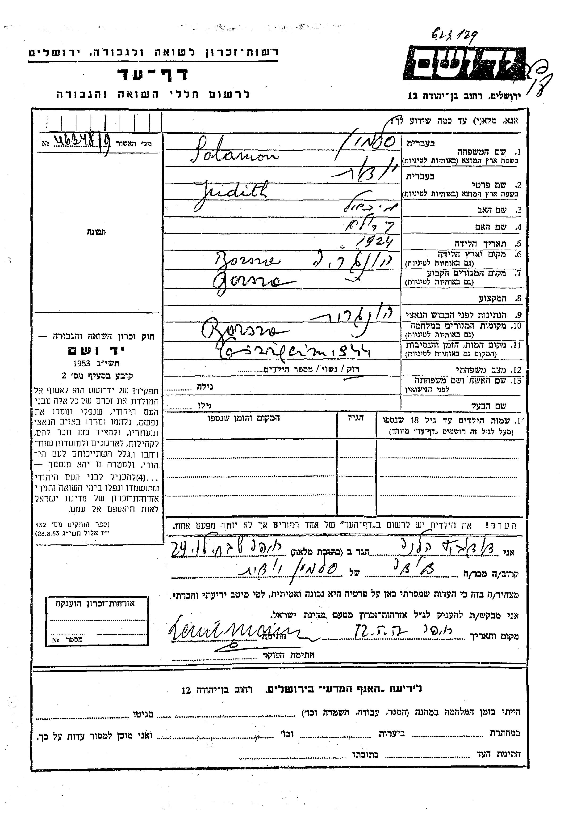 Batya Yehudit Solomon Salamon wurde im Jahr 1924 geboren. Sie war Schüler/-in.