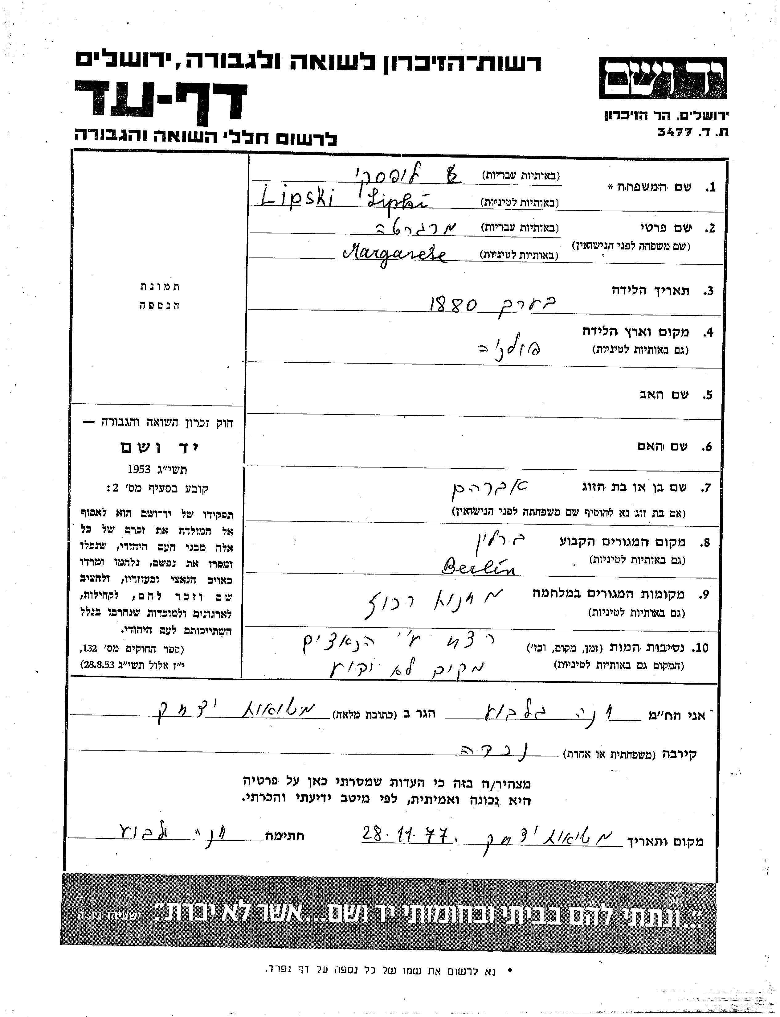 Margareta Lipski wurde im Jahr 1880 in Polen geboren. Vor dem Zweiten Weltkrieg lebte sie in Berlin, Deutsches Reich.