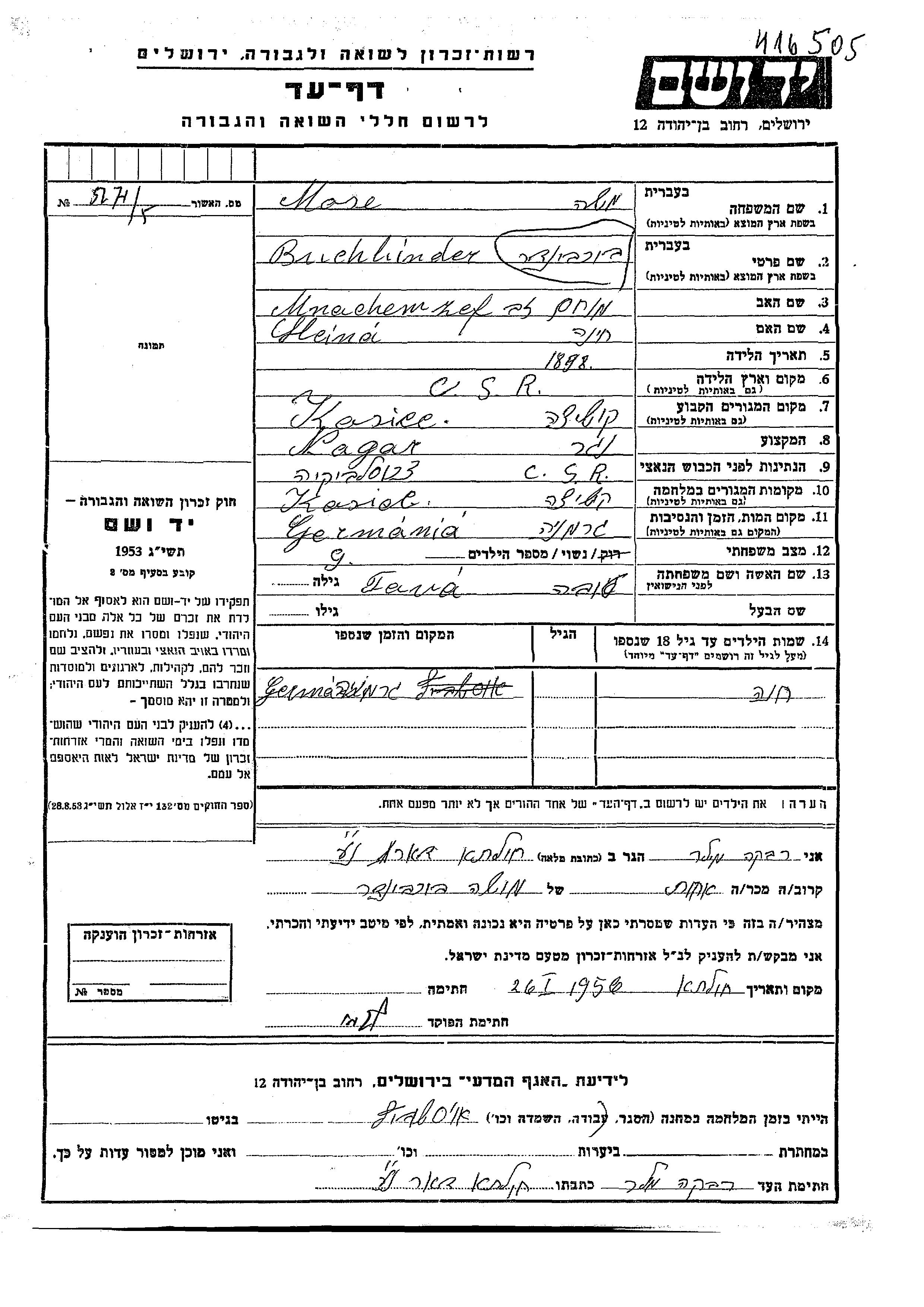 Mose Buchbinder wurde im Jahr 1898 in Kosice, Tschechoslowakei geboren. Er war der Sohn von Mnachem Zeev und Heina. Er war Zimmermann und mit Tova Verheiratet. Vor dem Zweiten Weltkrieg lebte er in Kosice, Tschechoslowakei. Während des Krieges war er in Kosice, Tschechoslowakei.